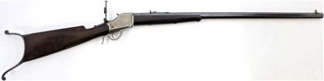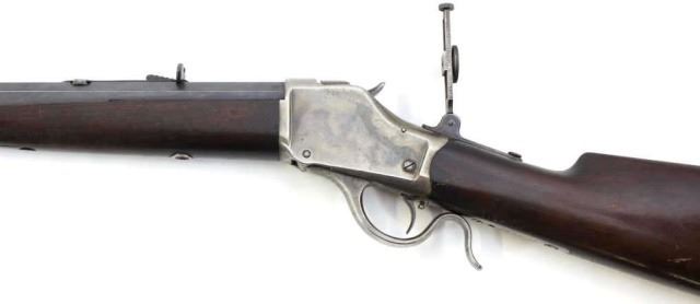 Winchester 1885 32-40 cal. SN 70XXX highwallsingle shot rifle 30" #3 barrel, case hardened and blue finish, walnut stocks with Schutzen style butt, single set trigger, folding front, sporting rear and 75 yard tang sights. Very good condition barrel showing85-90% blue, bright older refinished case color, stocks with only light handling and use mars, left side sliver missing on forend, black schabble tip intact. Action and bore very good. Frome Jerome Kingfus collection.Antique. Est. 850-1600