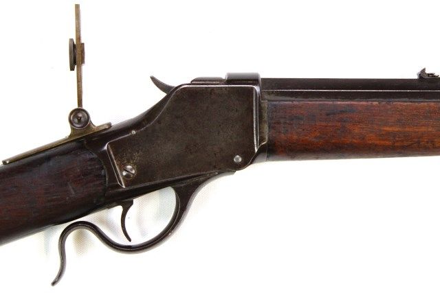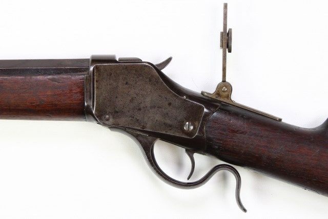 single shot High Wall rifle 32" No. 3 octagon barrel with standard walnut stocks and crescent butt plate, barrel shows natural brown patina, knife blade front and scarce 3 leaf Winchester Express rear sights. Receiver shows silver gray to brown patina and midrange tang mounted sight. Walnut stocks good, dark original oil stained finish. Action very good with fair bore. Mfg'd 1893 Antique, Est. 2500-3200