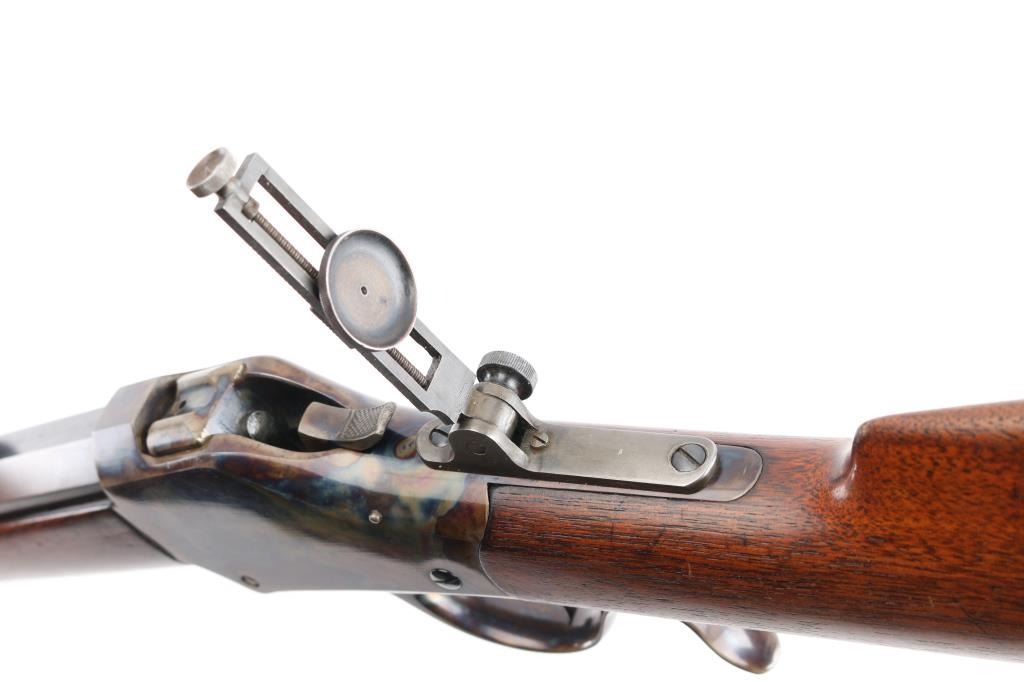 This Rifle has been professionally restored. Manufactured in 1885, (First year of manufacture) chambered in the rare 40-70 Sharps caliber and has a 30"octagon barrel. The top barrel flat ahead of the rear sight is marked "-MANUFACTURED BY THE--WINCHESTER REPEATING ARMS CO. NEW HAVEN, CONN. U.S.A.-" and "40-70 Sharps Str" at the breech. The serial number is marked on the lower tang with the patent date marking directly behind the trigger. Globe, post, adjustable front and adjustable buck horn rear sights. Adjustable Peep sight installed on the tang. Blue barrel with casehardened receiver, lever and buttplate, and mounted with a smooth walnut forearm and straight grip stock with Schnabel tip forearm with ebony forend insert and crescent buttplate. Bore is excellent/bright, the refinished blue, & case colors are excellent, and the refinished wood is near excellent with some very minor dings. Markings are crisp. Really a great looking rifle. NRA Condition-Excellent as Restored. Antique Firearm.