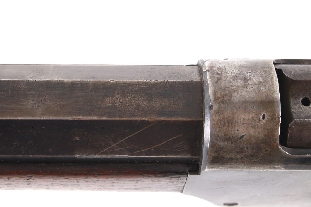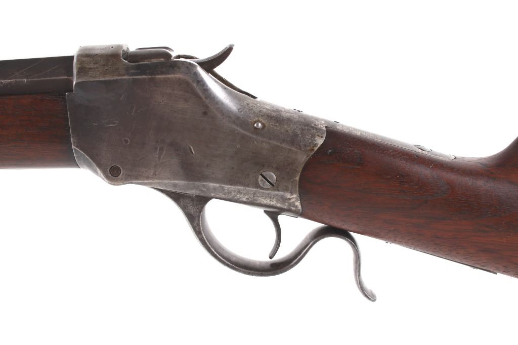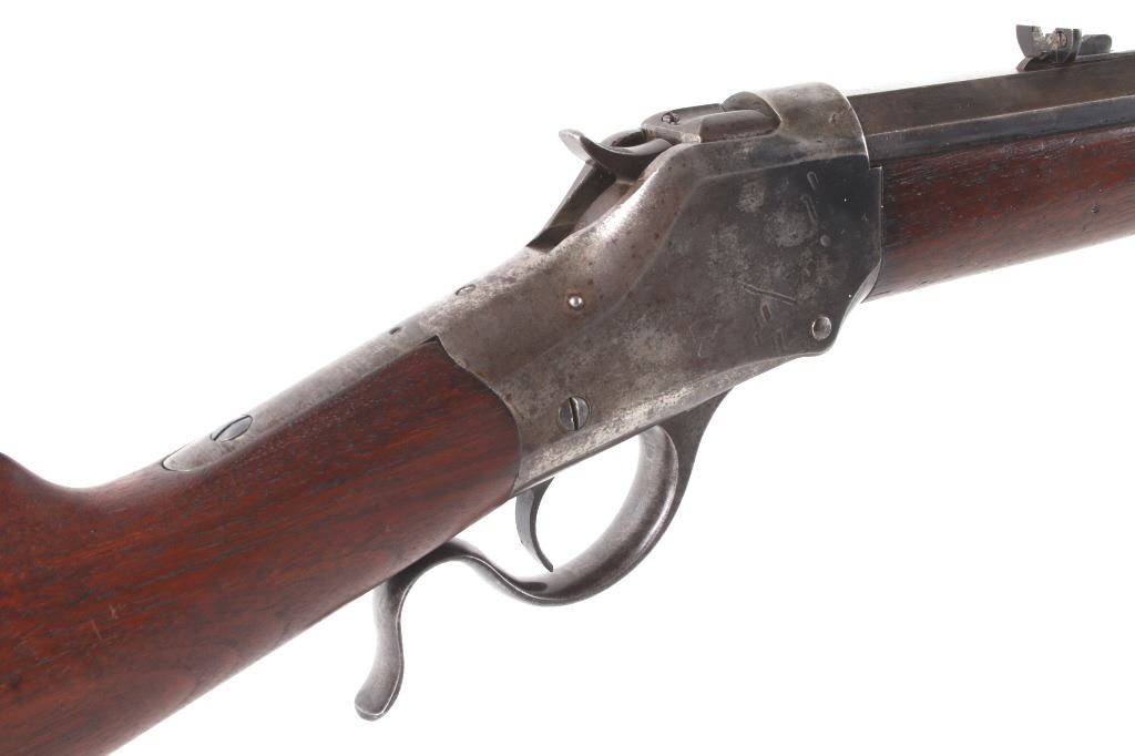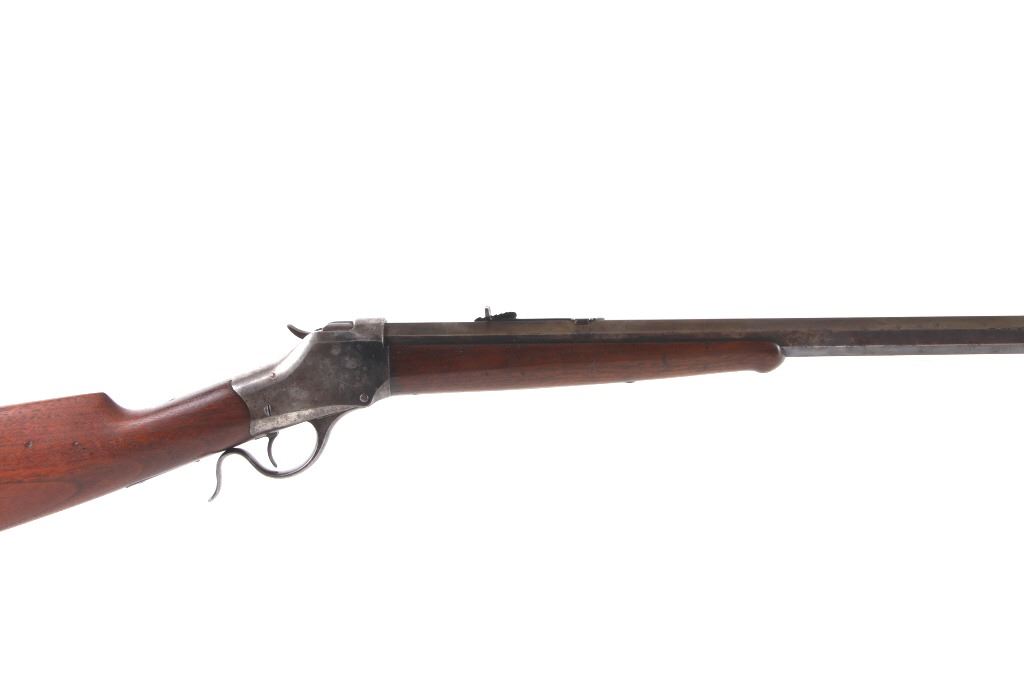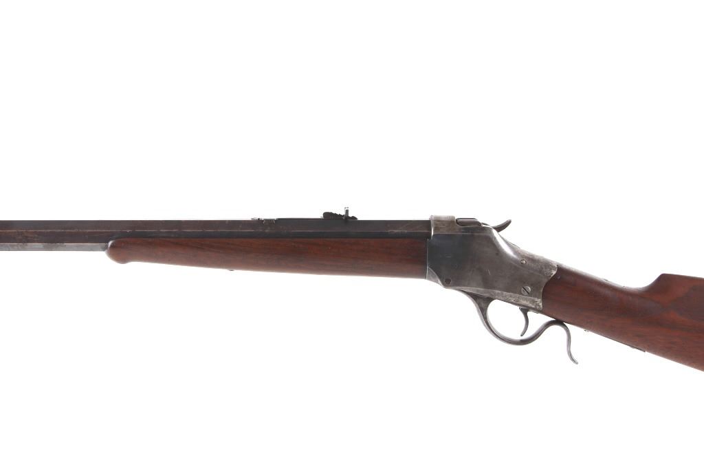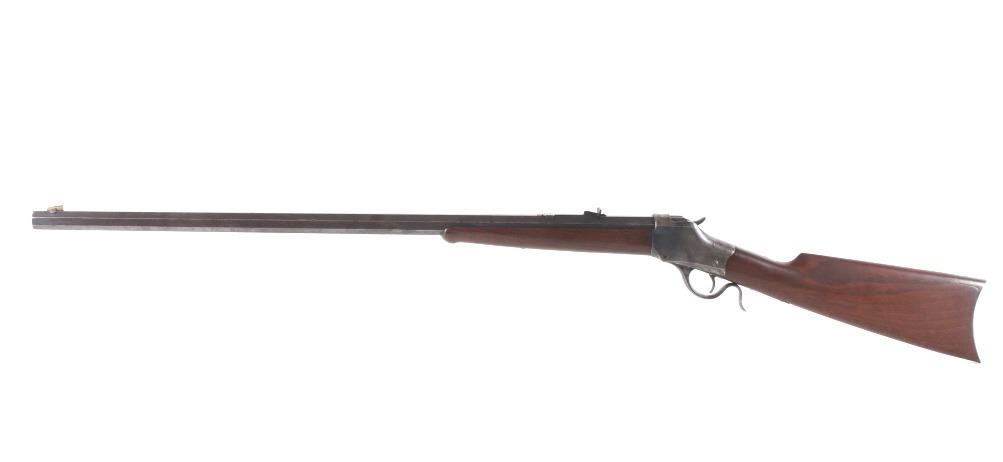 Winchester 1885 rare “Thickside Highwall” single shot rifle in very limited production .40-70 Ballard caliber. The 1885 single shot rifle was standard with a “Thinside” receiver in which the forward and rear edges of the receiver flair where the receiver meets the stock and forend. This rarely encountered “Thickside” receiver is flat across its length and was usually only used on special order rifles of large caliber. Winchester made almost 140,000 1885 single shot rifles and of these only 316 were chambered for the powerful .40-70 Ballard caliber. Few in this caliber have survived to the