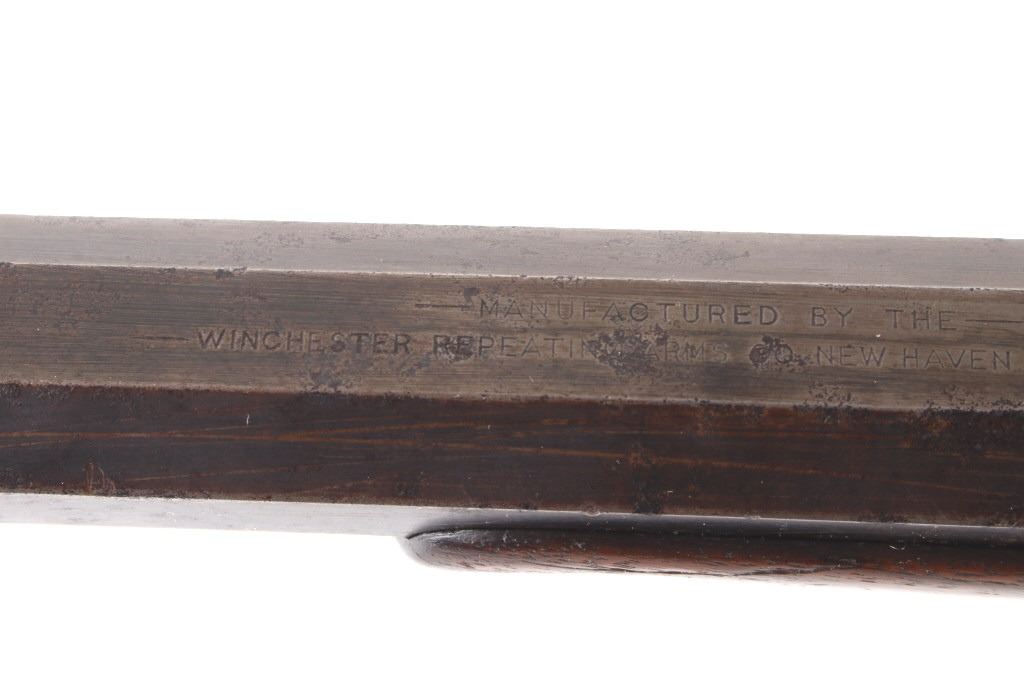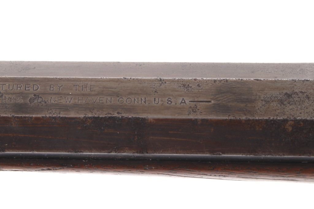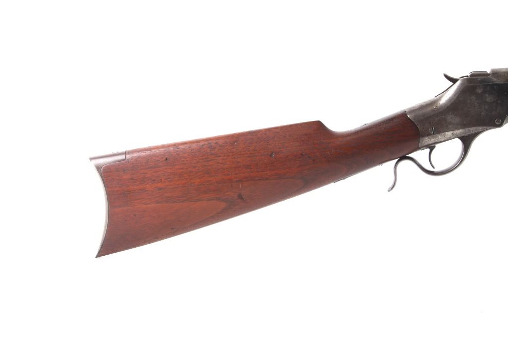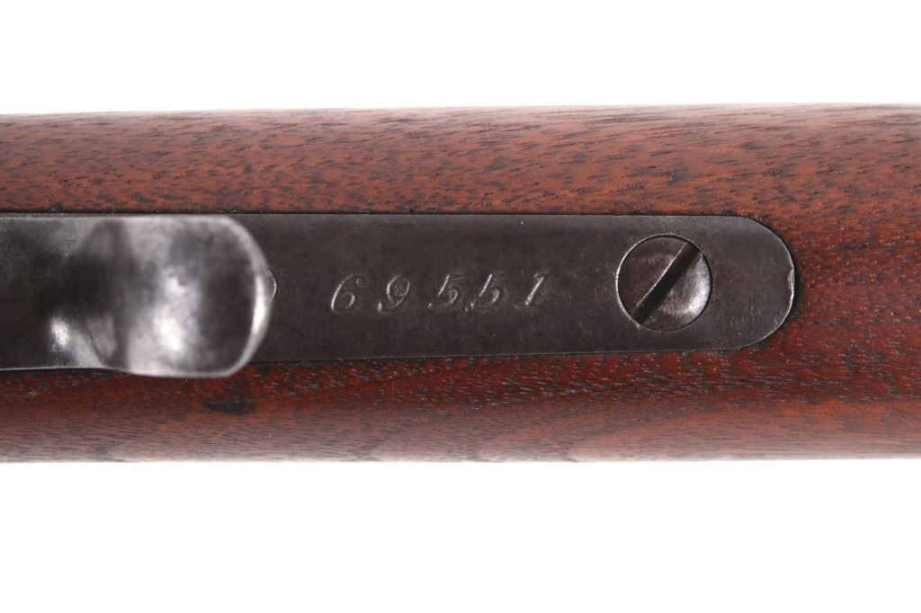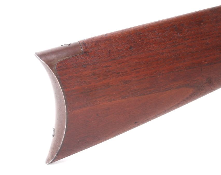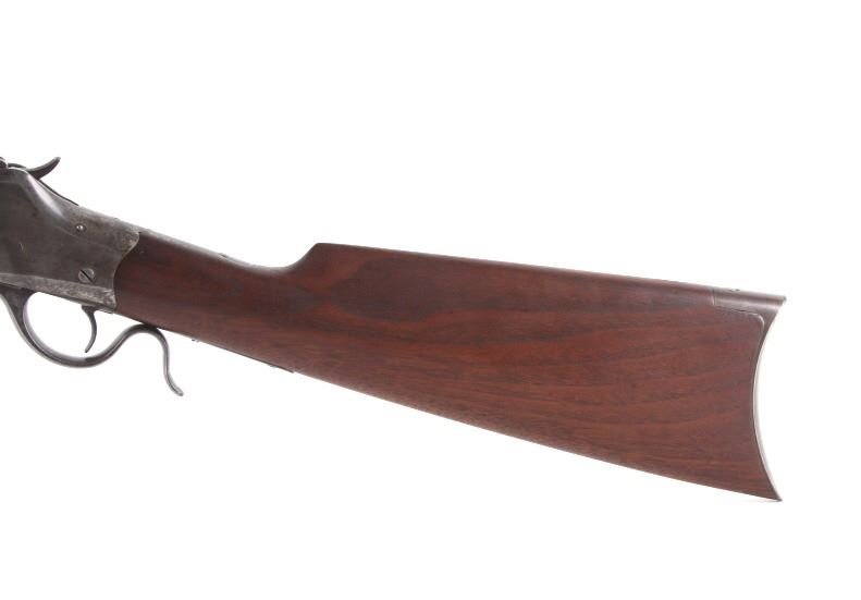 present and existing examples are seldom encountered. The Model 1885 single shot rifle was John Browning’s first design that was purchased by Winchester and began their long business relationship. It is one of the more difficult of the early Winchester rifles to obtain today in any caliber. This example with serial number 69551 was made in 1894. Aside from the rare thickside receiver, this rifle features a stout 30” No. 3 weight octagon barrel. The stock sports a crescent steel butt plate and is in very fine condition with tight wood to metal fit. The forend is also very fine and retains the factory ebony wedge” inlay in the forend tip. The receiver shows a lovely mottled gray patina while the barrel retains very good aged blue. All Winchester barrel markings are fine and the barrel is fitted with a buckhorn rear sight with elevator bar intact along with a Rocky Mountain blade front sight. The action is tight and the trigger pull is still light and crisp. The bore is fairly bright and excellent showing sharp rifling indicating that while this big game rifle was used, it was meticulously cared for. This was a serious, heavy caliber big game rifle that no doubt saw service in the frontier West. A fine and handsome rifle with an extremely rare thickside receiver in an equally rare big caliber. The rifle weighs 9lbs. Serial Number: 69551. This firearm qualifies as an Antique, and does not require FFL Transfer or NICS Background Check.
