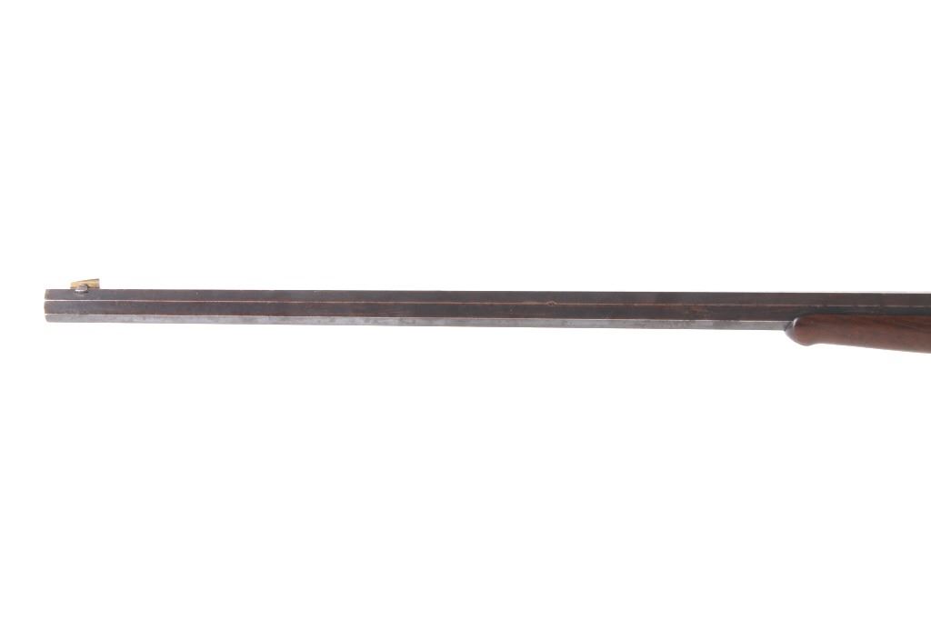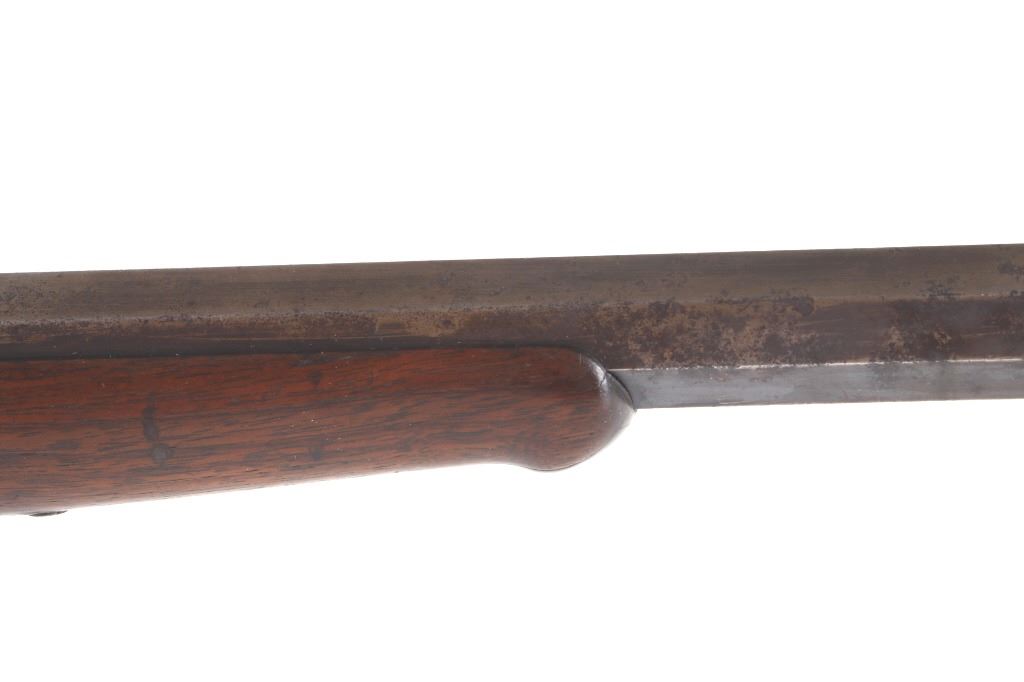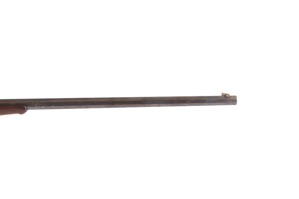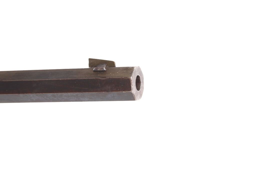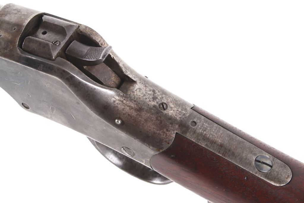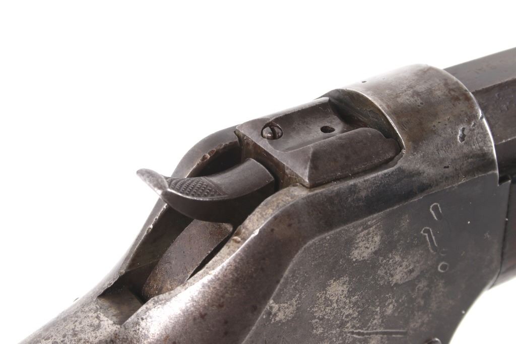 present and existing examples are seldom encountered. The Model 1885 single shot rifle was John Browning’s first design that was purchased by Winchester and began their long business relationship. It is one of the more difficult of the early Winchester rifles to obtain today in any caliber. This example with serial number 69551 was made in 1894. Aside from the rare thickside receiver, this rifle features a stout 30” No. 3 weight octagon barrel. The stock sports a crescent steel butt plate and is in very fine condition with tight wood to metal fit. The forend is also very fine and retains the factory ebony wedge” inlay in the forend tip. The receiver shows a lovely mottled gray patina while the barrel retains very good aged blue. All Winchester barrel markings are fine and the barrel is fitted with a buckhorn rear sight with elevator bar intact along with a Rocky Mountain blade front sight. The action is tight and the trigger pull is still light and crisp. The bore is fairly bright and excellent showing sharp rifling indicating that while this big game rifle was used, it was meticulously cared for. This was a serious, heavy caliber big game rifle that no doubt saw service in the frontier West. A fine and handsome rifle with an extremely rare thickside receiver in an equally rare big caliber. The rifle weighs 9lbs. Serial Number: 69551. This firearm qualifies as an Antique, and does not require FFL Transfer or NICS Background Check.