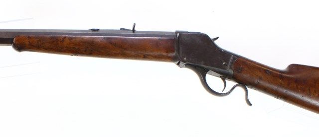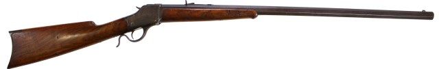 shot High Wall rifle 30" No. 3 octagon barrel, blue and case hardened finish, with standard walnut stocks, crescent iron butt plate. Condition very good overall barrel with pleasing blue brown patina, sharp barrel address, fixed front and sporting rear sights, receiver case hardened toned to uncleaned gray brown. Walnut stocks unsanded very good. Action firm with good bore. Mfg'd 1913 Modern. Est. 2250-2900