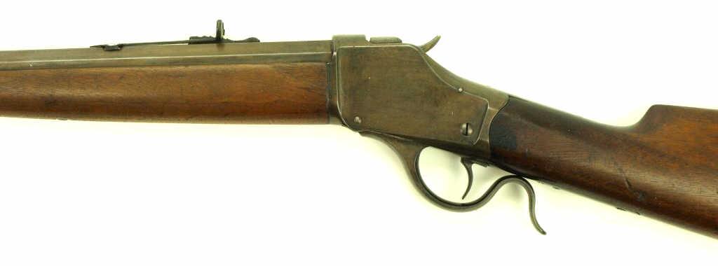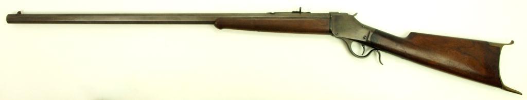 single shot rifle 30" octagon barrel, straight grain walnut stocks, brass schuetzen butt plate. Metal surfaces show brown over gray finish, sharp markings, good to very good stocks with light knick & dings, upper tang drilled for sight, now plugged. Firm action, fair bore. Mfg'd. 1890. NO FFL Required.