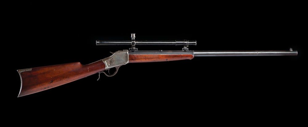 Winchester 1885 High Wall Single Shot Rifle. S/N 57853, circa 1892, .32-40 caliber, 26 3/4" half-round barrel, standard crescent butt wood, early “octagon” frame, period Wollensak 4x scope. CONDITION: 95% barrel blue thinning, excellent bright bore, 95% case color on frame, wood is very good with use dings, light layer of oil added, sharp markings, believe tang has been changed.