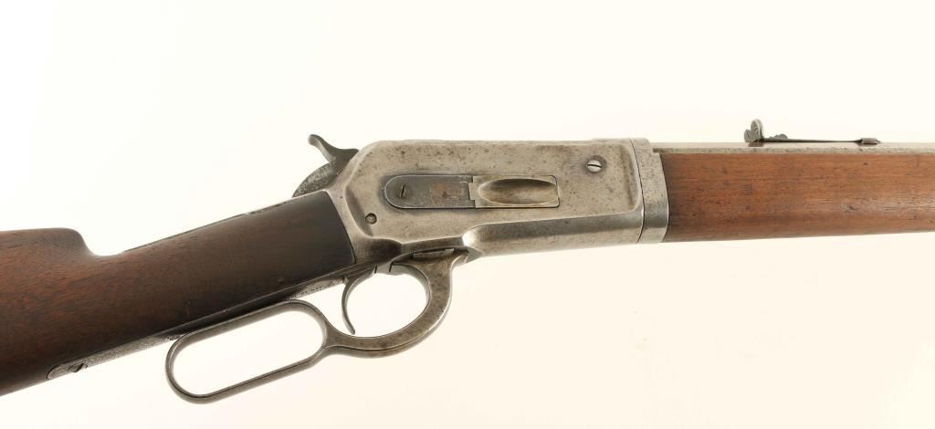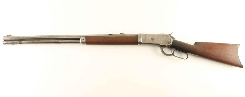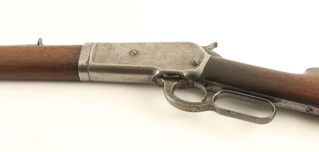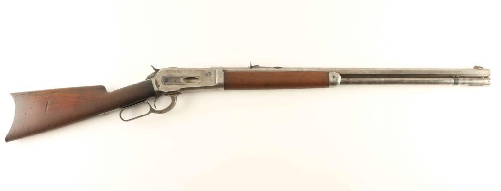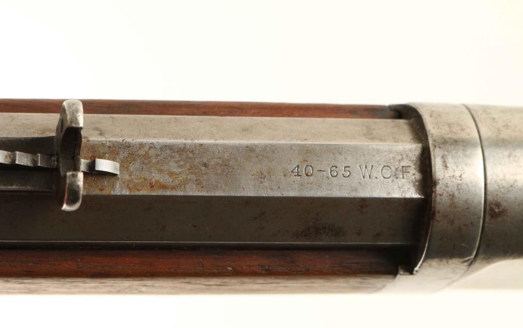 Large frame take-down lever action repeating rifle chambered in .40-65 Winchester, manufactured circa 1895. Features a blued finish, 26" take-down octagon barrel marked "-MANUFACTURED BY THE-/-WINCHESTER REPEATING ARMS CO. NEW HAVEN CONN. U.S.A.-", full-length magazine tube, dovetailed blade front sight with bead top, semi-buckhorn adjustable rear sporting sight, smooth trigger, checkered hammer spur, smooth walnut forend with metal cap and straight grip shoulder stock with crescent metal buttplate. Rifle exhibits strong bluing on the magazine ring, spring cover plate on the right side of the receiver & bolt with the rest of the metal surfaces in-the-white bearing a light amount of pin prick pitting & some traces of bluing. Action is smooth, the bore is near excellent, markings are clear and the wood stocks are very good+ with shrinkage around the wrist. Condition is NRA Very Good. ***Antique Firearm***