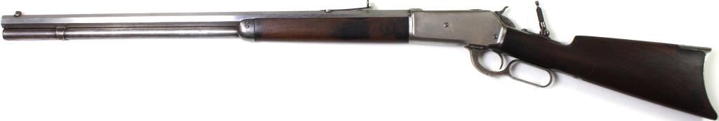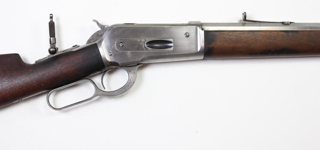 Winchester 1886 .40-65 cal. SN 56513 lever action rifle with standard 26" octagon barrel, full mag, straight walnut stocks, rear tang sight and crescent buttplate. Rifle has been polished to silver, Lyman ivory bead front and Buckhorn rear sights, walnulever action rifle with standard 26" octagon barrel, full mag, straight walnut stocks, rear tang sight and crescent buttplate. Rifle has been polished to silver, Lyman ivory bead front and Buckhorn rear sights, walnut