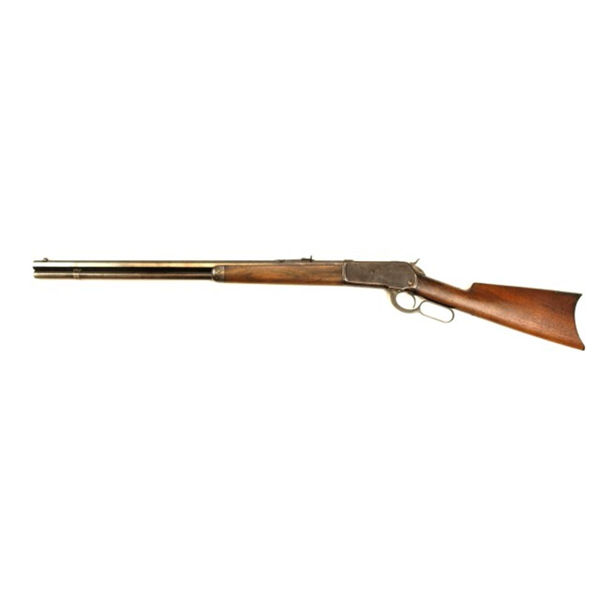 Winchester 1886 40-82 cal SN 64193 lever action rifle, 26" octagon barrel, full magazine and straight grain walnut stocks with crescent buttplate. Barrel shows bright blue refinish thinned to gray at caliber stamping area, mag tube showing thin blue drifting to brown, brown receiver with scattered pin prick pitting. Walnut stocks good with tight wood to metal fit possibly lightly sanded the action smooth with nice bore. Manufactured in 1892. No FFL required.