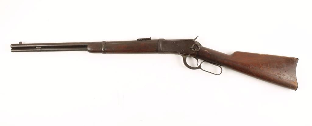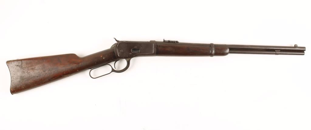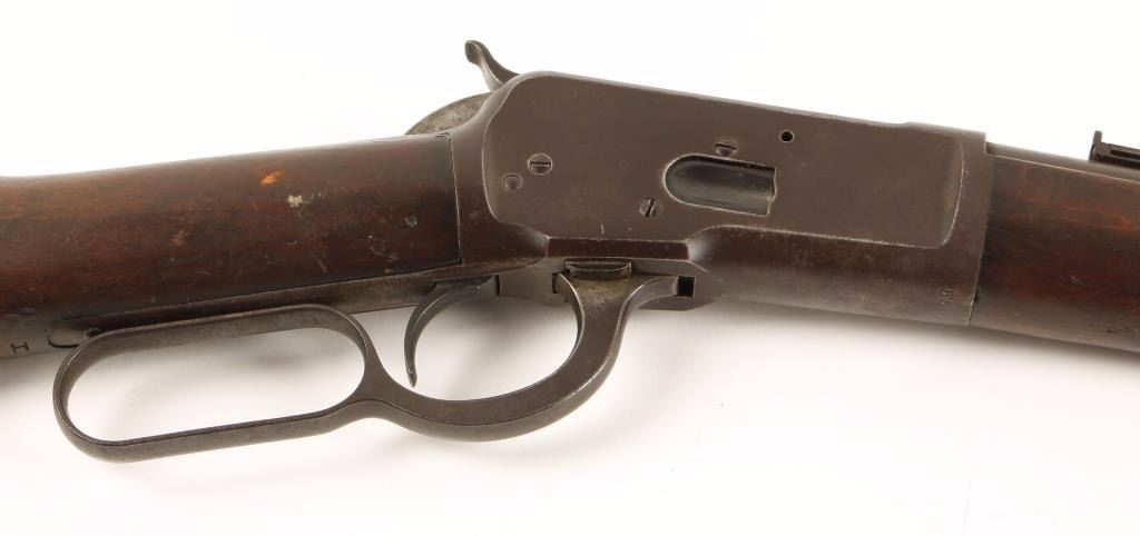Lever action tube-fed repeating rifle chambered in .30 Winchester Center Fire, circa 1910. Features a fully blued finish, 20" tapered barrel, raised front sight, folding 0-15 range rear sight, saddle ring, full tube magazine, checkered hammer spur and plain Walnut forearm and straight grip shoulder stock with metal carbine buttplate. Finish has turned to an even brown patina overall with high wear on top of the barrel by the barrel band. Action is smooth, bore is good and stock shows heavy wear. Condition is good as near antique. ***C&R Firearm*** ***Modern Firearm***