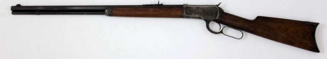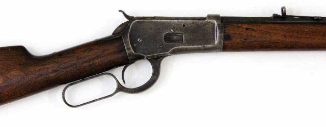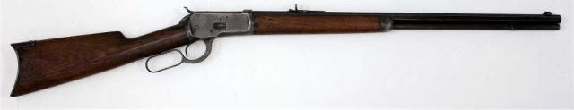 Winchester 1892 .32WCF SN 484XXXlever action rifle, 24" octagon barrel, full magazine with walnut stocks, barrel and magazine tube show an old reblued refinish, the forend cap, lever, receiver, and crescent buttplate a silver gray patina with original blue in protected areas of receiver, walnut stocks good, small chip at right from area of tang, good fit to metal, very good action and bore. Modern. Est. 750-1200