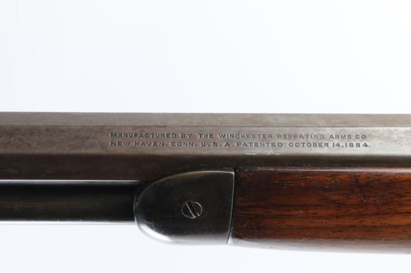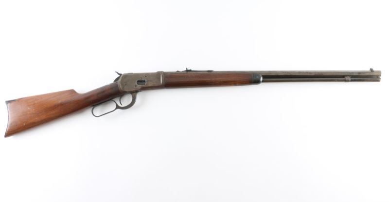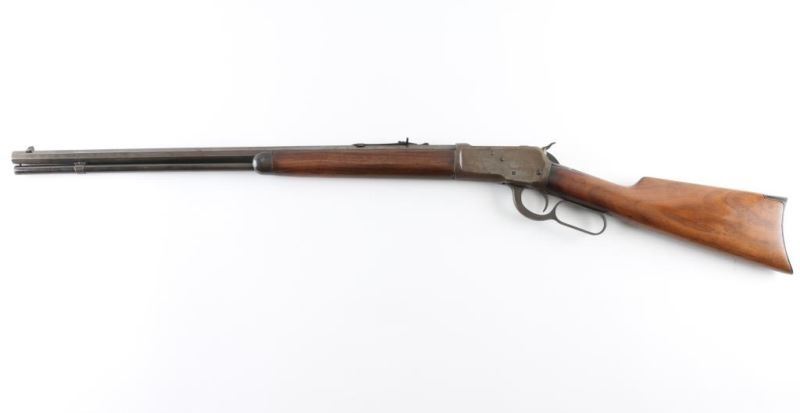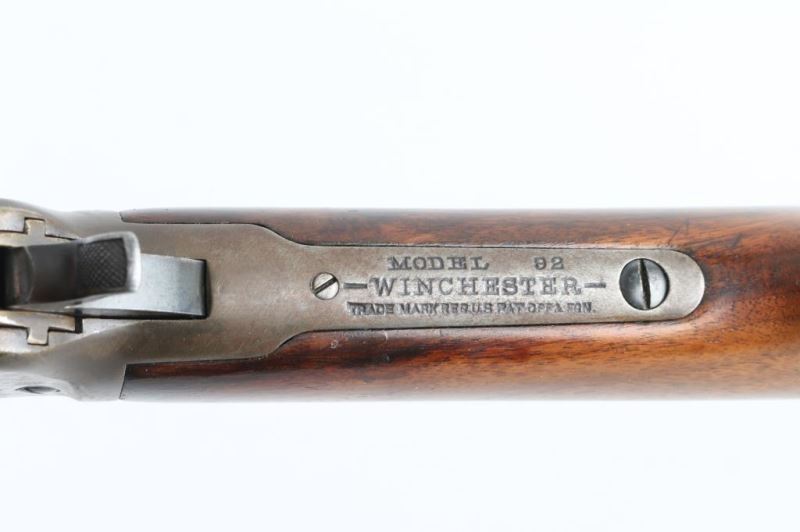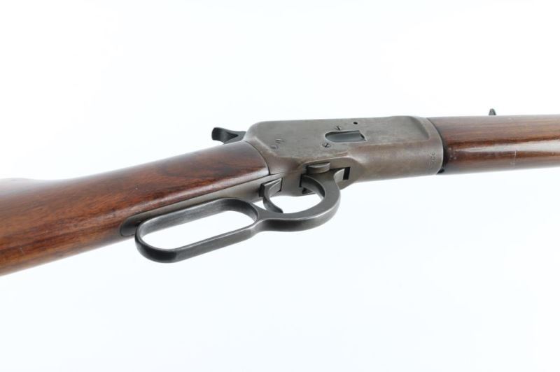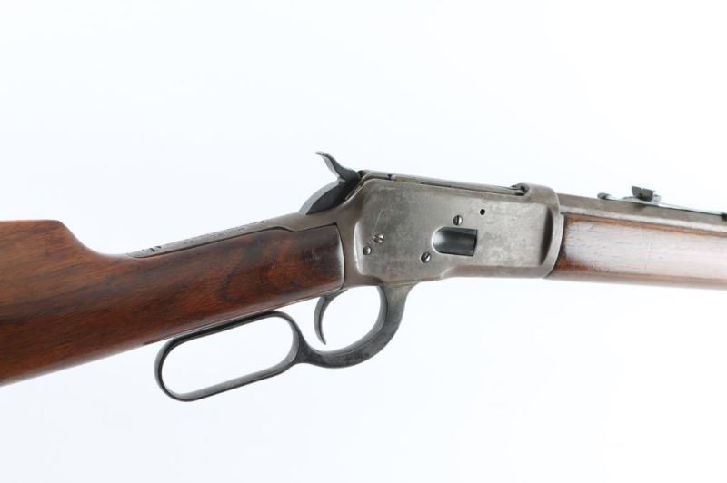 Lever action rifle manufactured circa 1924. Features 24" octagon barrel with full length mag, sporting sights, crescent butt, smooth walnut forend & stock. Bore is good condition, bright with some frosting. Metal shows yellowish brown color, smooth textured on mag tube, slightly rough on receiver. Darker color on rear sight and hammer. Wood shows oil staining, light sanding and varnish re-finish, good fit to metal with slight shrinkage. Condition is NRA Good+ *** C&R Firearm ***