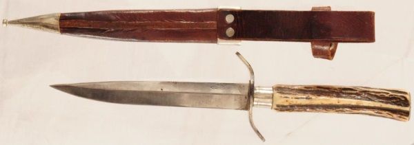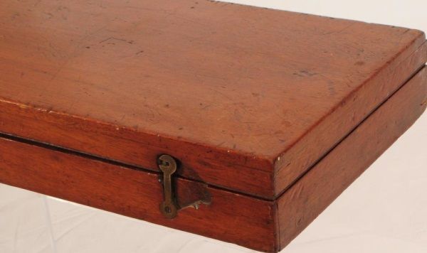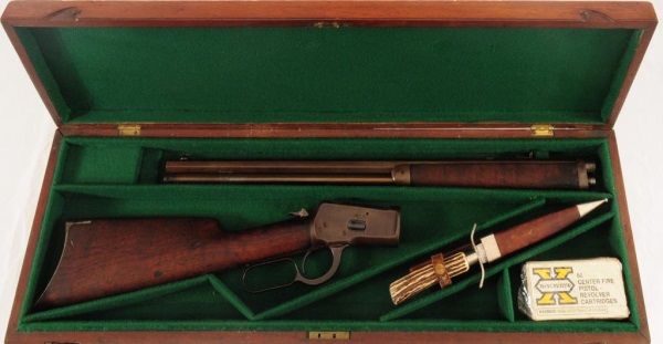 Antique. In original wooden case with knife and sheath and ammo. Manuf 1893.