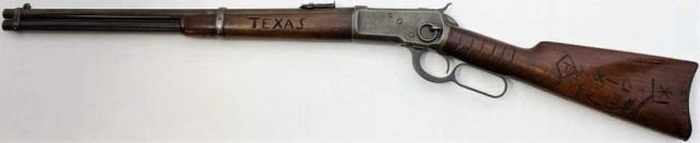 Winchester 1892 44-40 cal. SN 451XXXlever action carbine 20" standard barrel, walnut stocks heavily carved showing Texas and Capt Kidd on forearm, the butt with early brands including XXX, Diamond T, X bar L the end of stock once tacked around buttplate,carving and tack holes are definitely early included is information on the Texas Kidd, owner of the last Wild West Show Virgil Nuckols, which began in 1917 ending in 1958. It is not known if this carbine wasassociated with the Texas Kidd show and should be further researched. Very good condition the barrel and receiver shows natural silver gray patina, hints of color in protected areas, magazine tube thinning dark blue probably an earlier replacement. The walnut stocks show excellent fit to metal NO cracks or repairs the carvings deep and period accomplished. Mechanically excellent with good bore. A used but well cared forWinchester with loads of character. Made in 1908. Modern. Est. 1500-2500