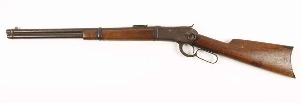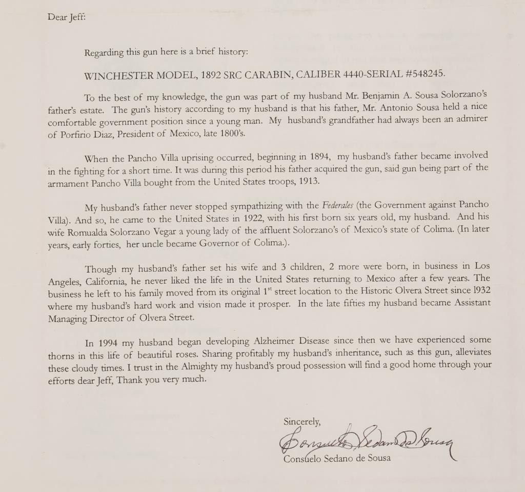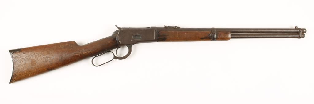 Classic lever action saddle ring carbine with a 20" round barrel. The muzzle is split and extremely corroded. This is missing the magazine tube end cap. This has a rifles crescent butt and buttplate. This auction includes a letter which purportedly gives a history of this firearm and claims that it was used in the Pancho Villa uprising in Mexico from 1910-1920. Condition; Relic *Modern Firearm*