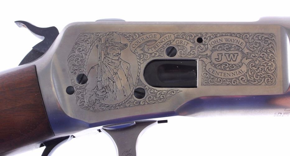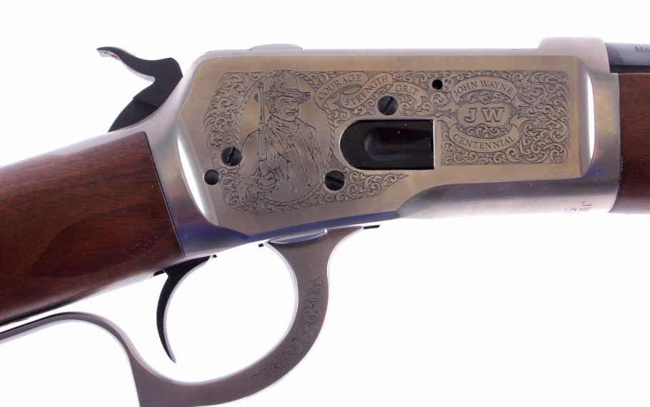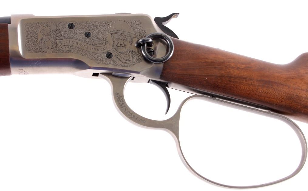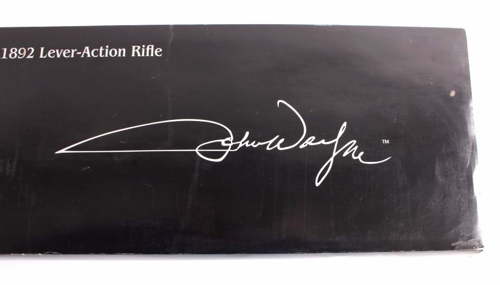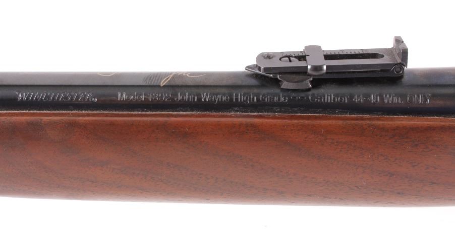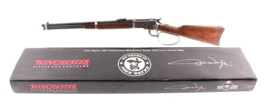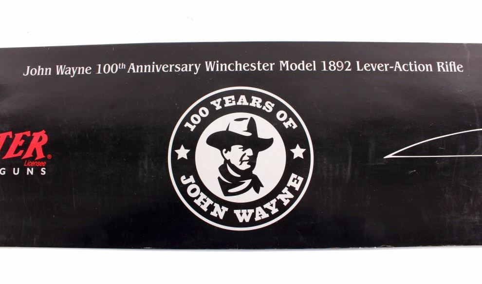This is a Winchester Model 1892 John Wayne Commemorative lever action rifle chambered in the .44-40 Winchester caliber. The rifle was made to celebrate the 100th anniversary of John Wayne (1907-1979). The rifle features a grade 2/3 walnut straight-grip stock, large loop lever, silver nitride finished receiver, barrel bands and receiver, inlaid medallion, polished blued round 18.5" barrel, and special ladder-style rear sight. Both sides of the receiver shows special factory engraving showing images of John Wayne and the motto "Courage, Strength, Grit". The rifle shows excellent, unfired condition and is new in the original box with paperwork. The rifle measures 36" long overall. Serial number is JW100H 5870. This is a modern firearm that requires an FFL or NICS background check to transfer.