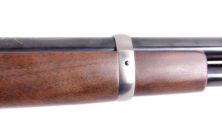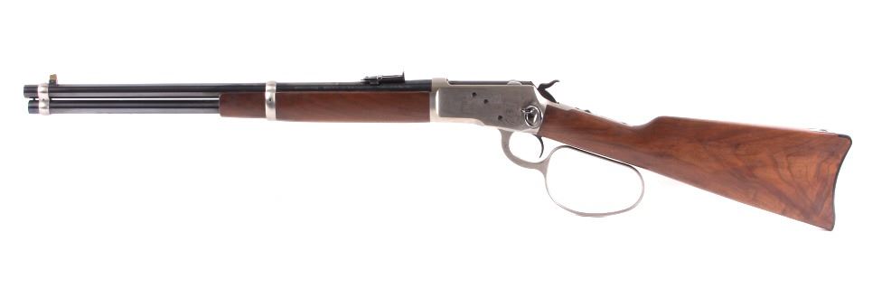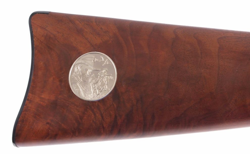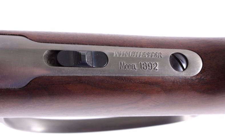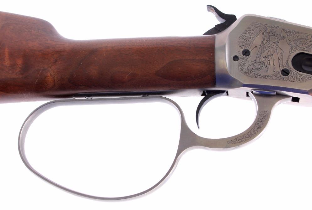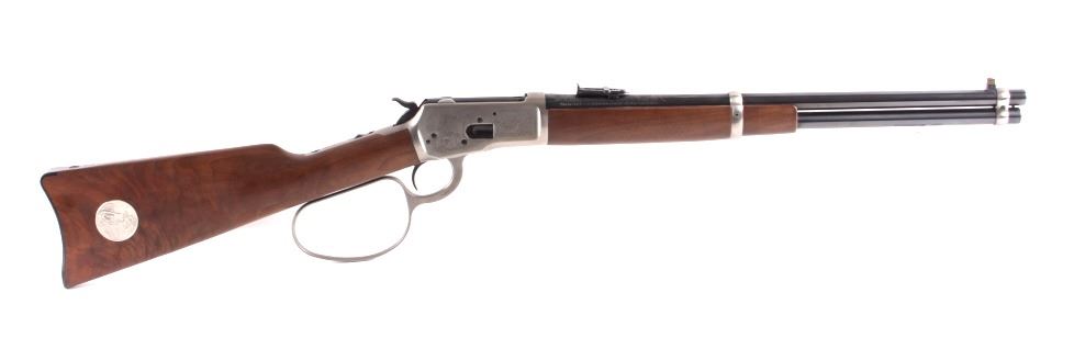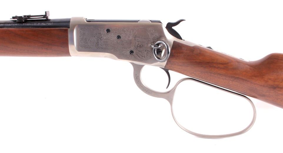 This is a Winchester Model 1892 John Wayne Commemorative lever action rifle chambered in the .44-40 Winchester caliber. The rifle was made to celebrate the 100th anniversary of John Wayne (1907-1979). The rifle features a grade 2/3 walnut straight-grip stock, large loop lever, silver nitride finished receiver, barrel bands and receiver, inlaid medallion, polished blued round 18.5" barrel, and special ladder-style rear sight. Both sides of the receiver shows special factory engraving showing images of John Wayne and the motto "Courage, Strength, Grit". The rifle shows excellent, unfired condition and is new in the original box with paperwork. The rifle measures 36" long overall. Serial number is JW100H 5870. This is a modern firearm that requires an FFL or NICS background check to transfer.