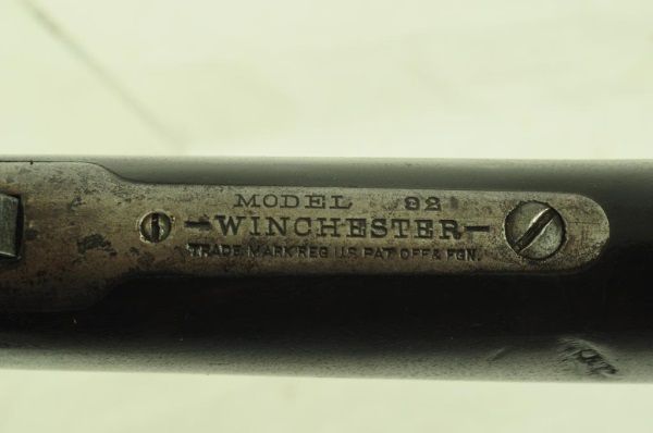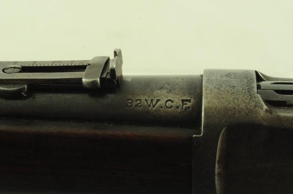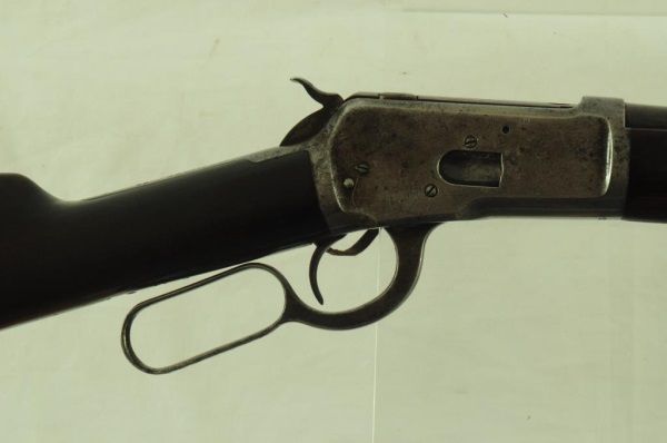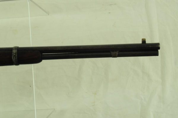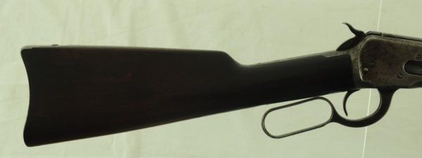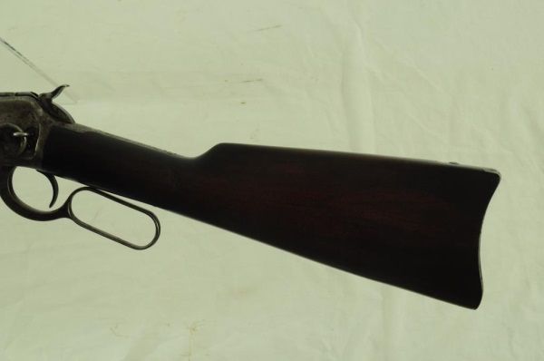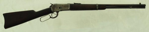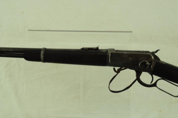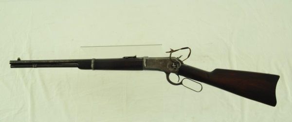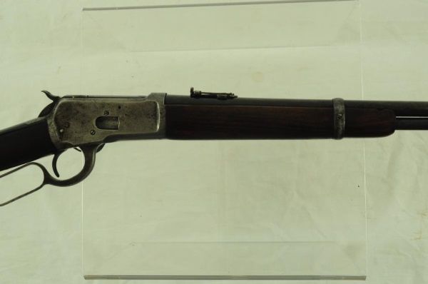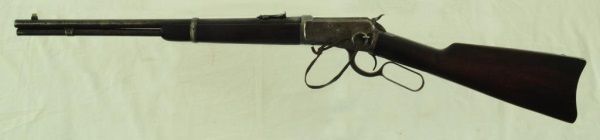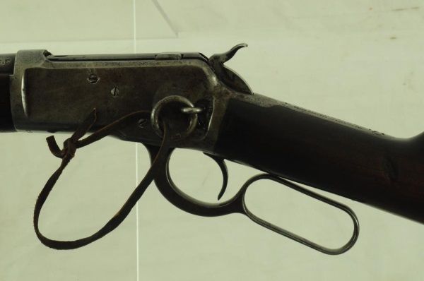 Lever action, saddle ring, elevated sights, long mag. With 1910 Heiser Scabbard, SN 2437. Barrel measures 20". Manuf. 1921