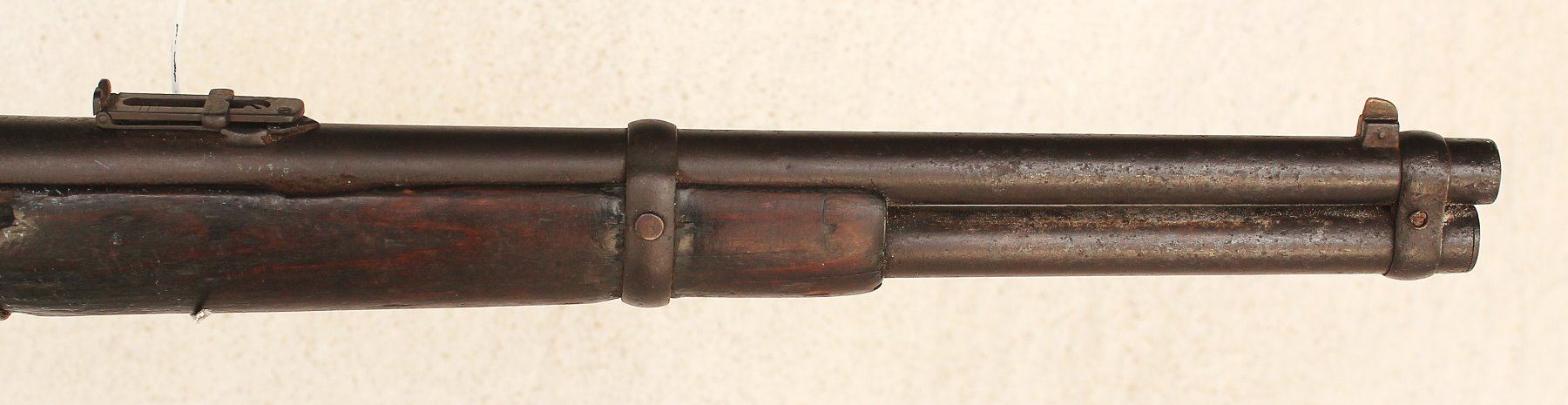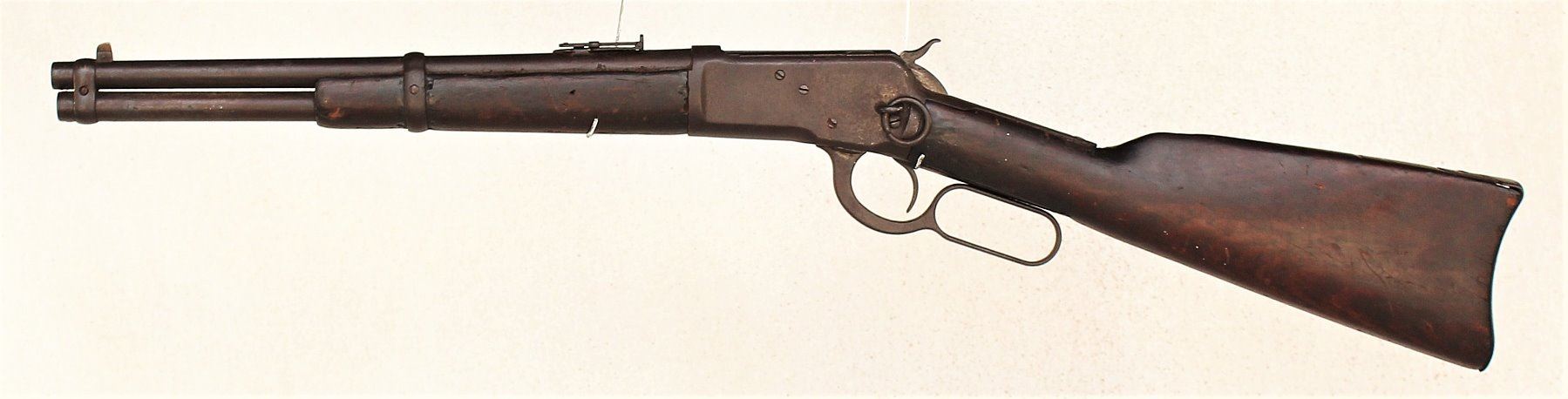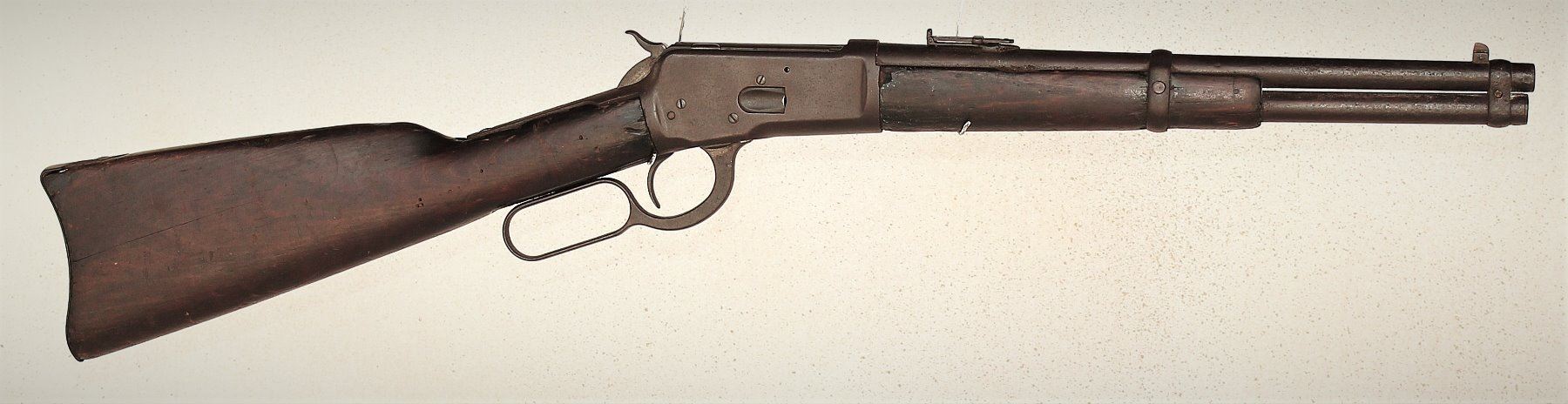 Extremely scarce 14" 1892 trapper, chambered in 44-40, in letterable range. With Winchester museum letter verifying configuration. A well used carbine with metal displaying a rich deep patina, and wood with wear and attractive medium color. Ser. #328xxx C&R