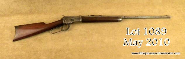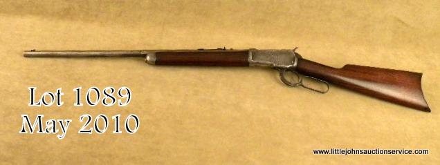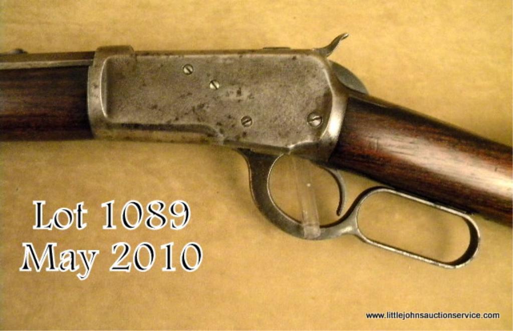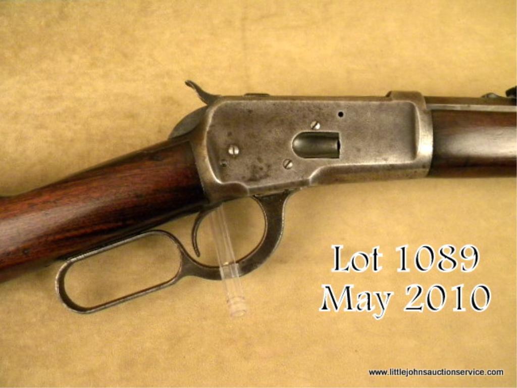 Winchester 1892 special order rifle, 24" half round half octagon barrel, .38-40 caliber, button mag, crescent butt, serial #847795. The metal surfaces show a metal patina finish with traces of original blue, some light cleaning long ago,scattered light to moderate erosion and surface pitting. The markings are good, the stocks have been lightly refinished, action good, bore fair to good with some wear. Est: $1,250 - $2,500