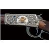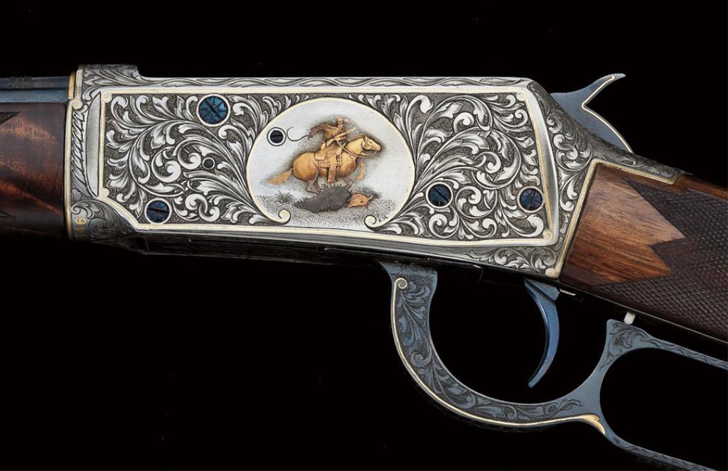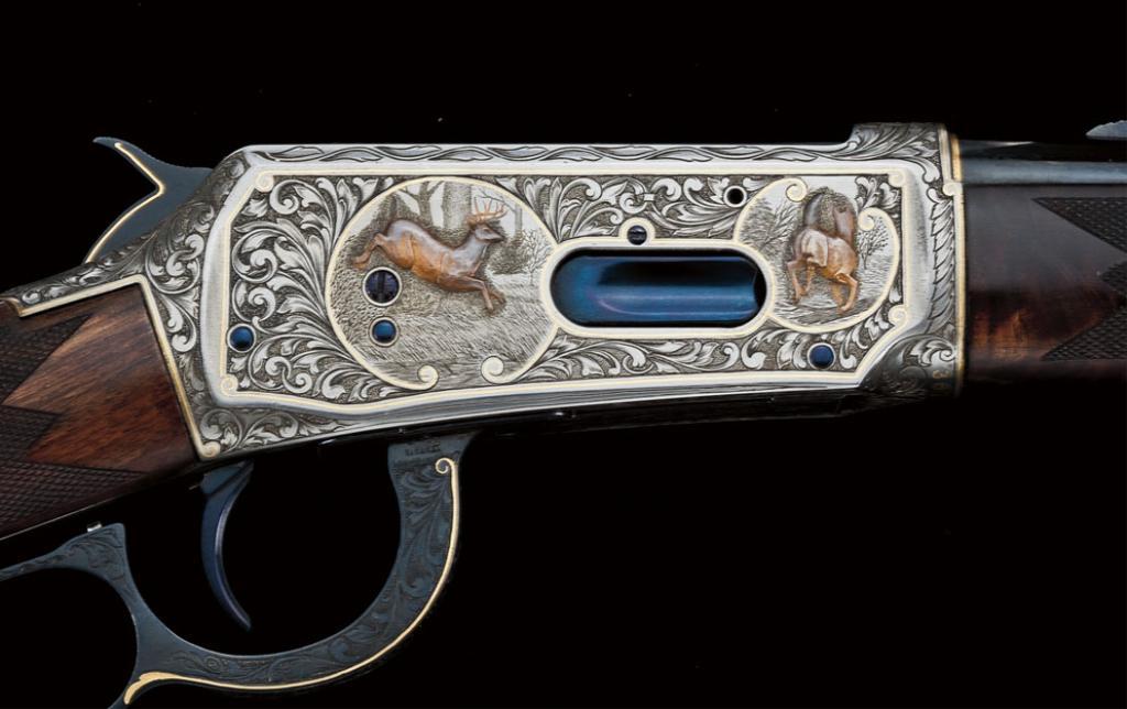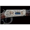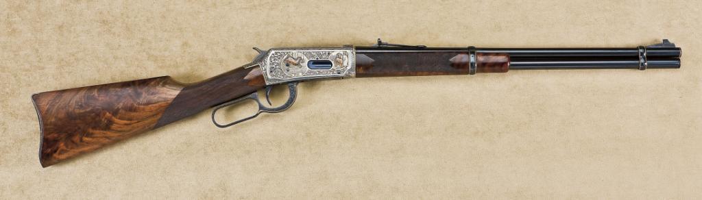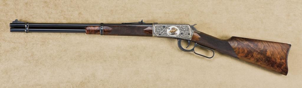 Winchester 1894, .30-30 caliber lever action carbine, fully and finely engraved and gold inlayed by master firearm engraver Ken Hurst and signed by him on center panel. The carbine shows Winchester rider in high relief on left; jumping stag and running doe and vignettes on right. The balance of the frame is nicely scroll engraved the barrel and magazine tube are royal blued with gold lines and matching accents to engraving. The carbine is richly stocked in deluxe burl walnut. The condition is excellent and shows no firing. The inlays show a copper content for an antique patina. Est: $4,500 - $7,500