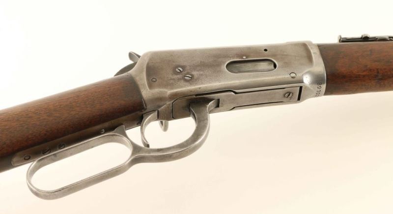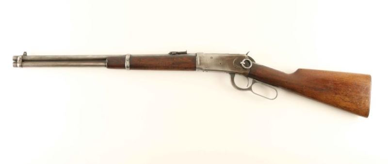 'Saddle Ring Carbine' Vintage lever action repeating rifle chambered in .30-30 Winchester, circa 1921. Features a blued finish, 20" barrel, full length tube magazine, two barrel bands, blade front sight with brass bead, flip-up ladder rear sight, saddle ring, smooth trigger, knurled hammer spur, grip safety, smooth gumwood forend and straight grip shoulder stock with knurled metal buttplate. Rifle exhibits less than 10% of it's original finish showing lots of honest wear with the majority of the metal surfaces in-the-white and the receiver & magazine tube showing a browning patina. Action is sound, bore is very good, markings are good and the wood stocks are good to very good with numerous blemishes. Condition is NRA Good. ***C&R Firearm***