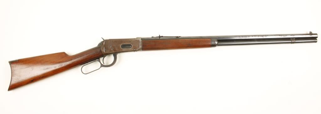 Blued lever-action rifle with a 26" octagon barrel. barrel has sharp edges with rust stains and pitting in the bluing. The receiver has turned a grey/brown and has light rust stains. Bore is shiny with good rifling. Forend cap and crescent buttplate have rust stains on faded bluing. Wood has scratches, dings and rubs with rounded edges. Action works well. Condition is good. *Modern Firearm^