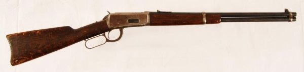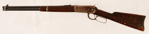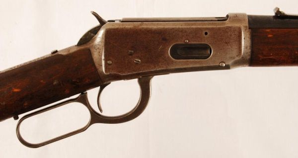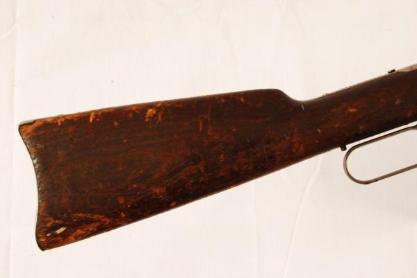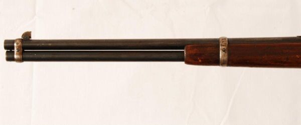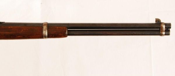 Saddle ring carbine, lever action, steel butt. Round barrel measures 20".