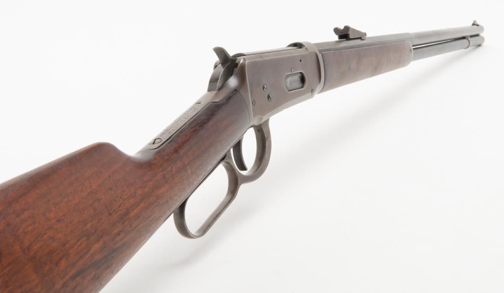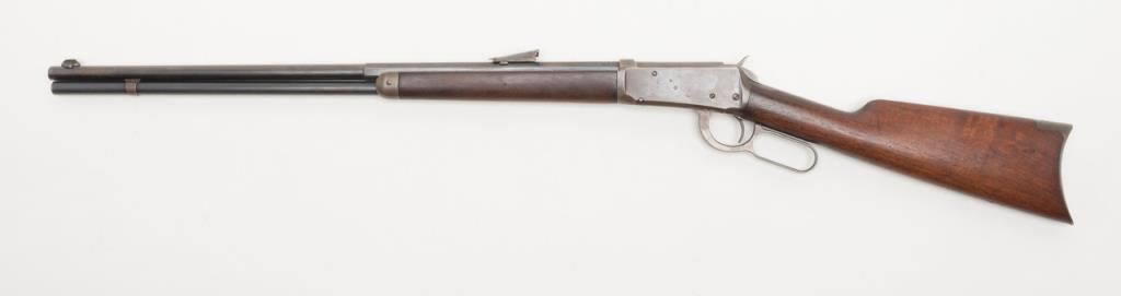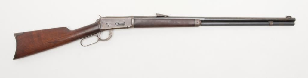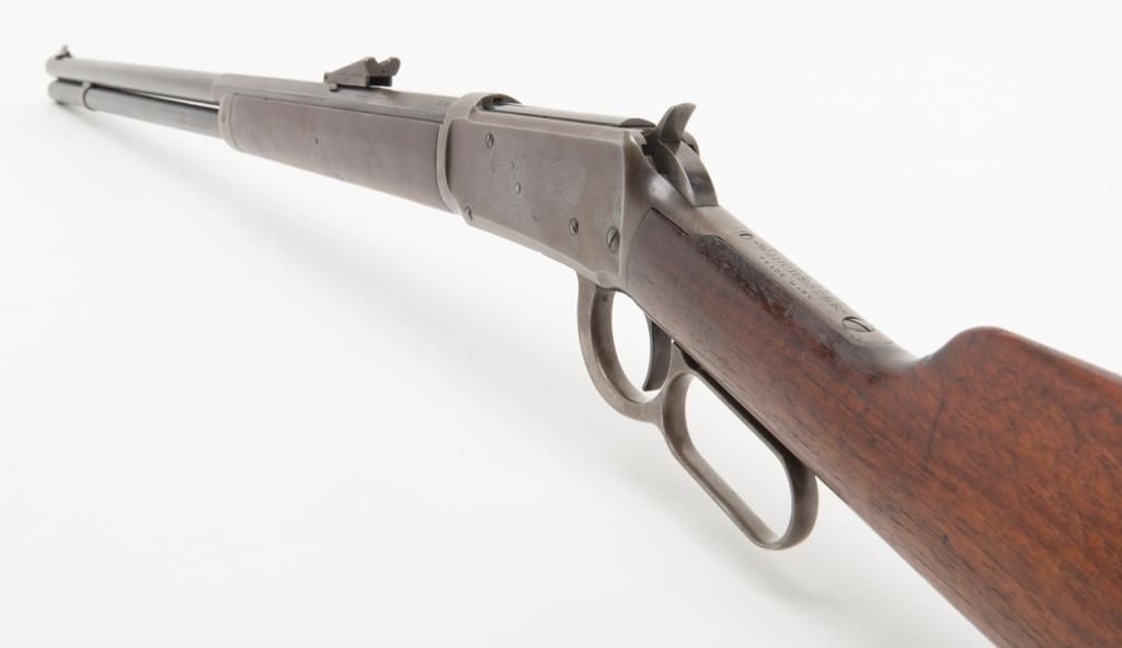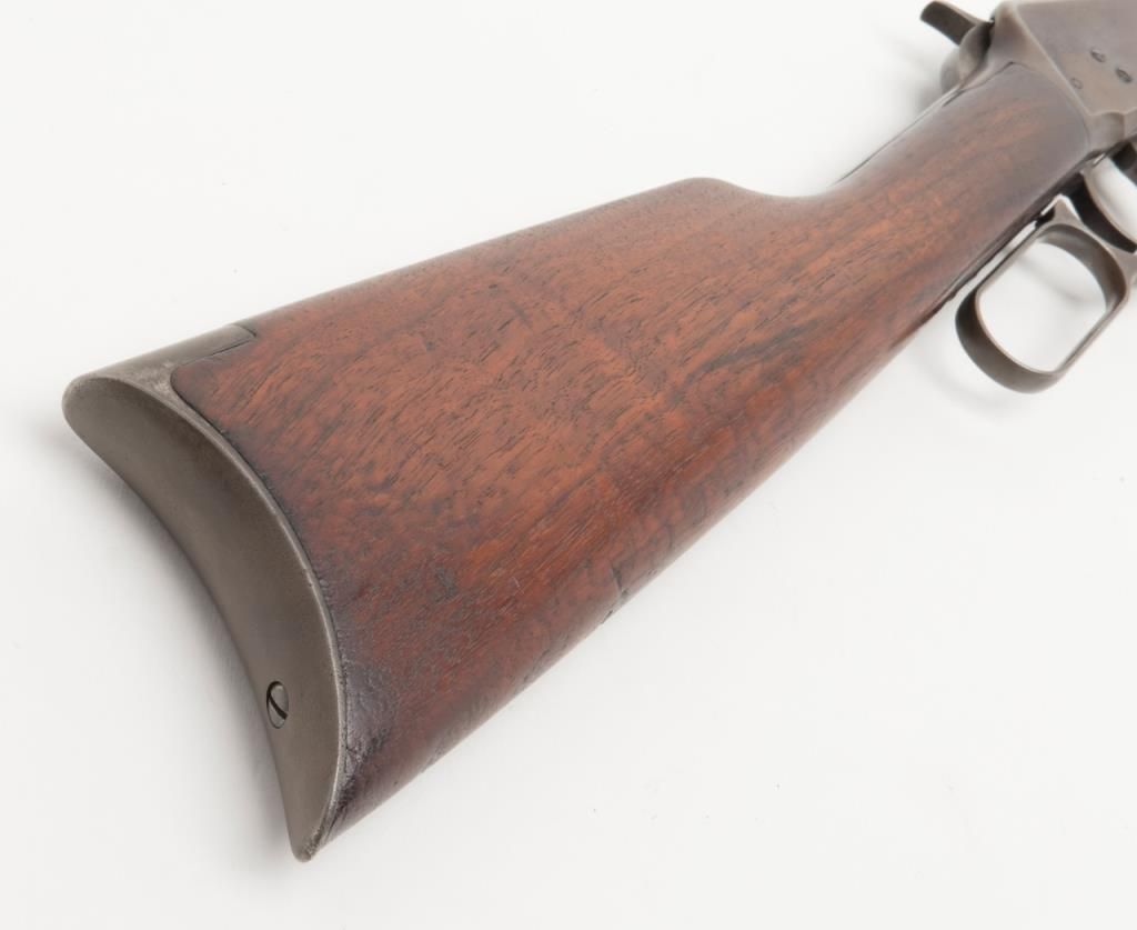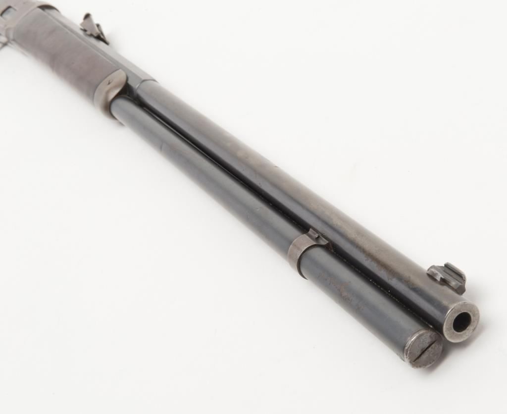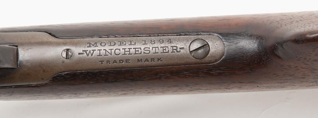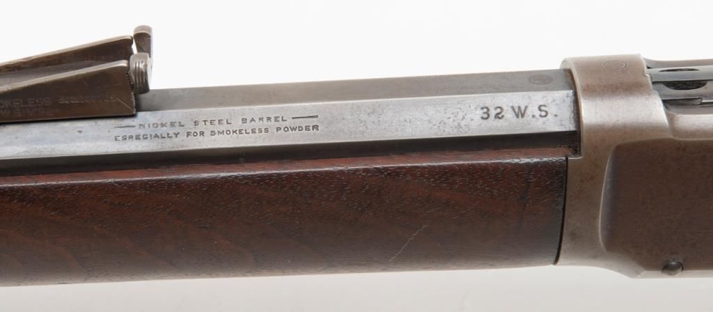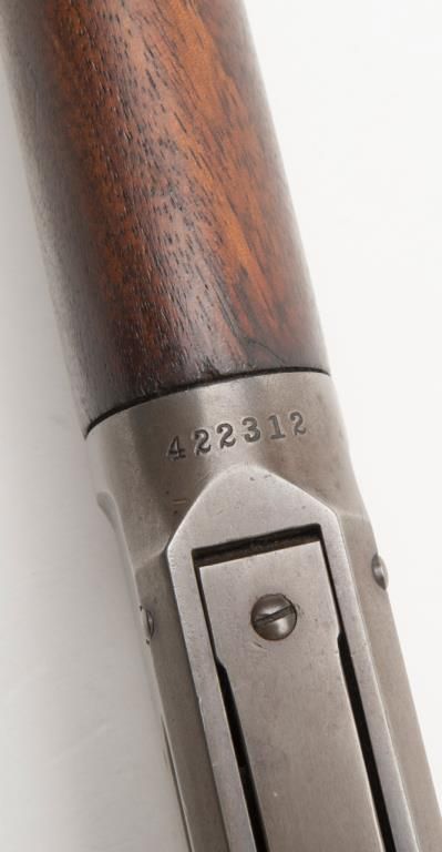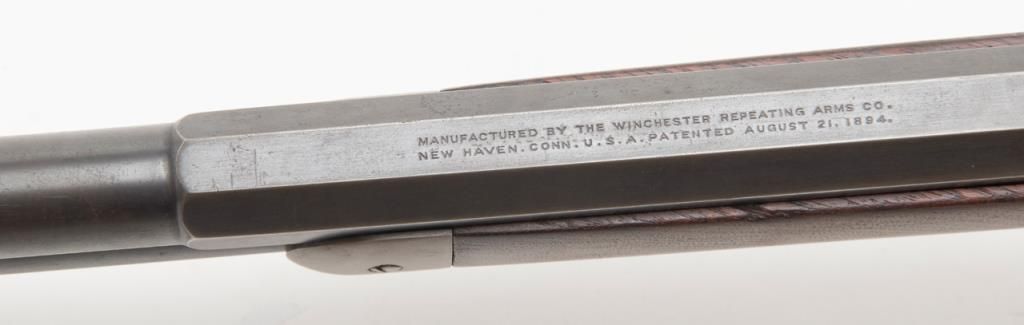 Winchester 1894 special order lever action in 32 Winchester Special caliber with a 26" half round/half octagon barrel, full mag, rifle butt, # 422312. The Winchester .32 special rear sight is retained with a King front sight. Approximately50% to 70% original blue remains with some drifting and toning. Minor pitting on two areas of the barrel. The wood is very good plus and the bore is bright with minor aging. A good 94. Est.: $750-$1500.