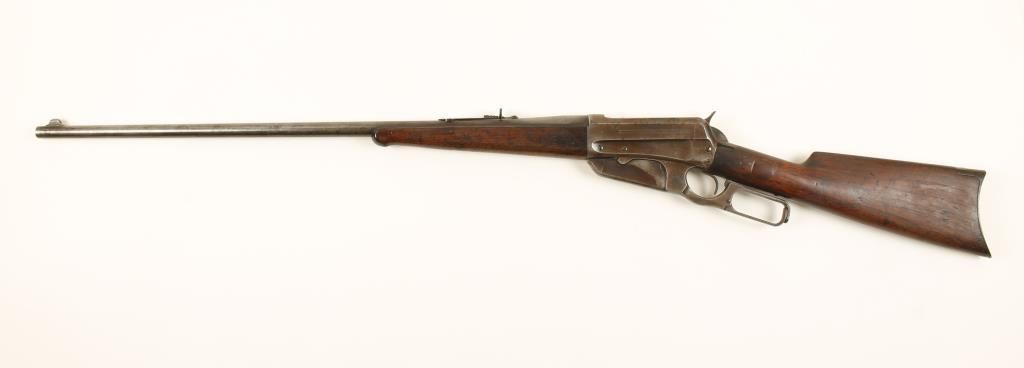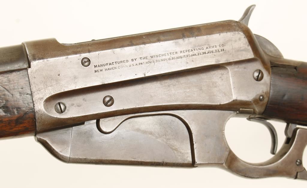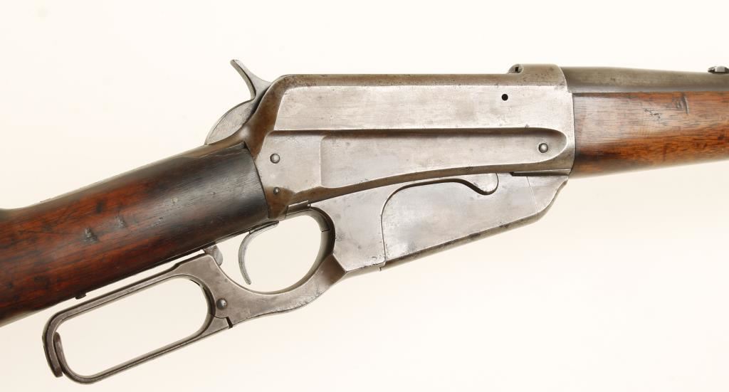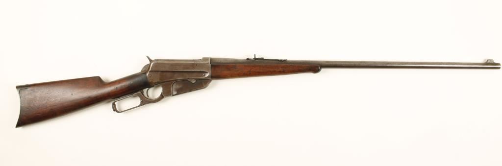 Blued lever-action rifle with a 28" barrel. Bluing has faded/worn off most of the rifle leaving a brown patina with rust stains and light pitting. Bore is frosty with strong rifling. Wood forend has a black ebony insert in Schnabel and is dinged and scratched with the initials "LSR" carved into it. Butt stock is dinged and scratched with a circular patch on the left side and a chip missing by the upper tang. Rear sight is correct as a semi-buckhorn with serrations. Condition is fair. *Modern Firearm^
