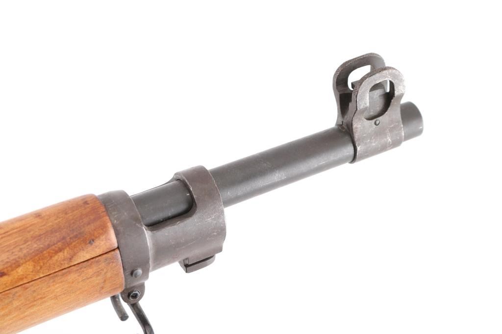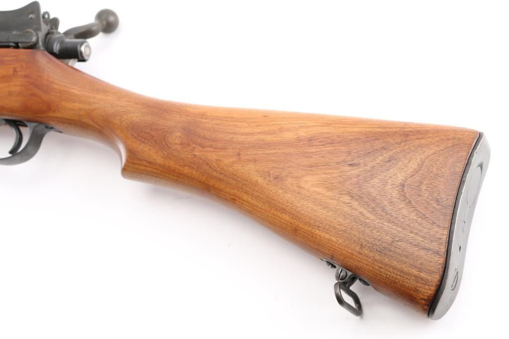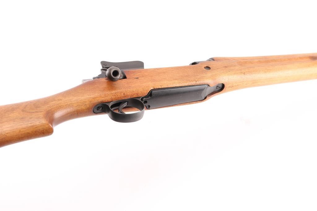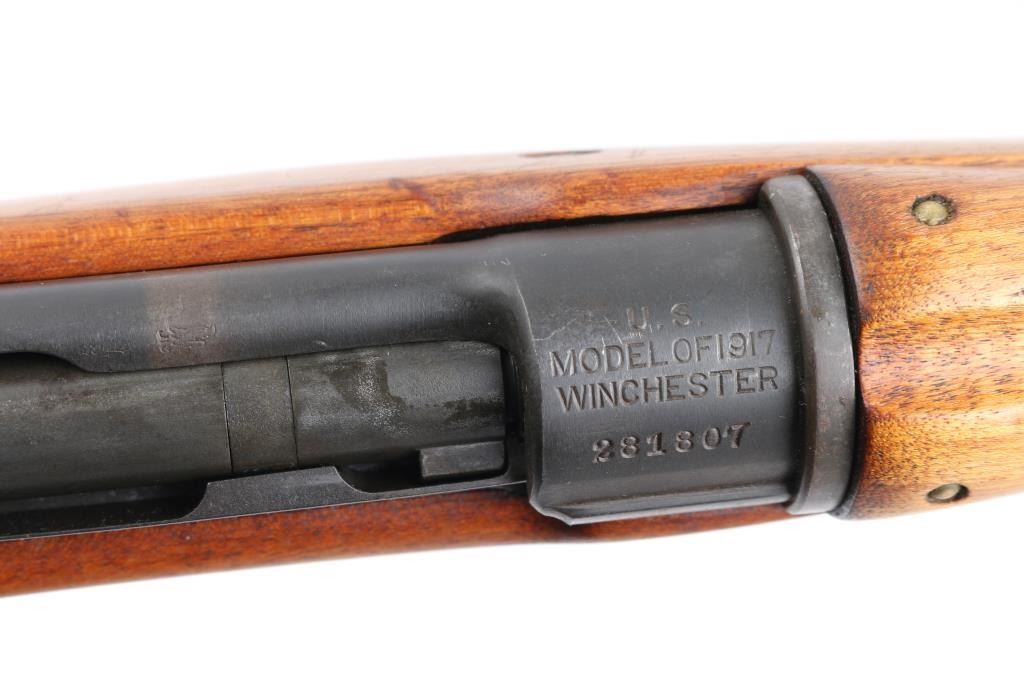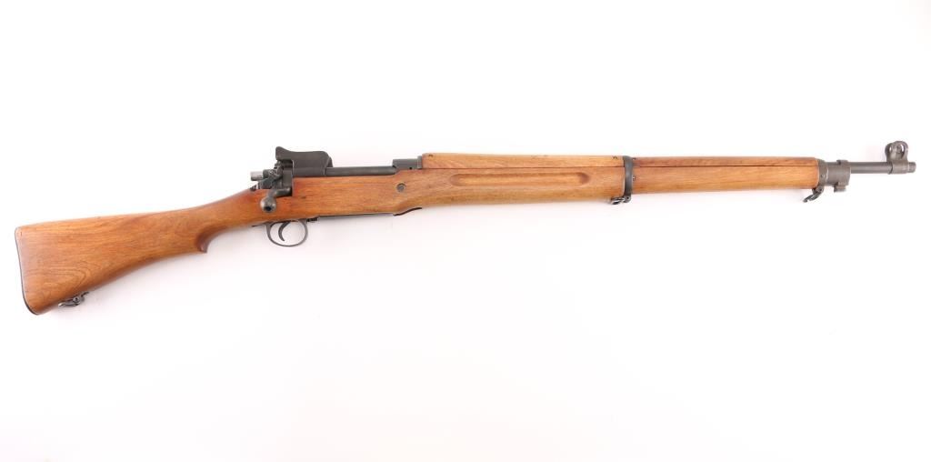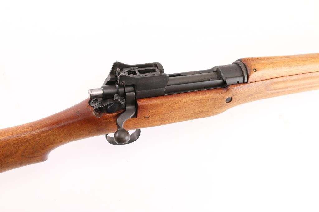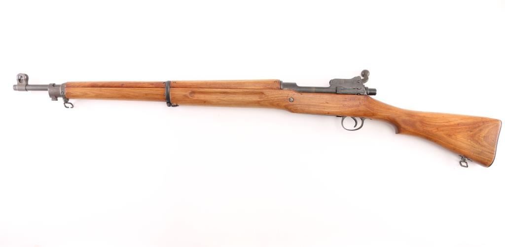 US military Mauser type bolt action rifle manufactured for use in WWI. Often referred to as "Enfield", due to British Enfield type rifling. Refinished with parkerizing, possibly arsenal applied. Features 26" barrel, blade front and peep rear ladder sights both protected by steel guards, manual safety, 6 round magazine, wood handguard & stock with grasping grooves, trap door in butt, sling swivels, stacking swivel. Bore is about good condition, frosted and a bit dark in the grooves, with strong rifling. Retains 90% satin medium gray parkerizing. Some smaller parts show a brownish color, receiver shows some blotches in color. Wood has been sanded and finished with a smooth semi-gloss result, shows loss of sharp edges in forend grooves. Metal fit to wood is overall good. Retains US Army Ordnance "bomb" marks, cartouches on stock "3GM-K" (in box), "AA". "W" marked barrel dated "5-18". Condition is NRA Very Good as refinished *** C&R Firearm ***