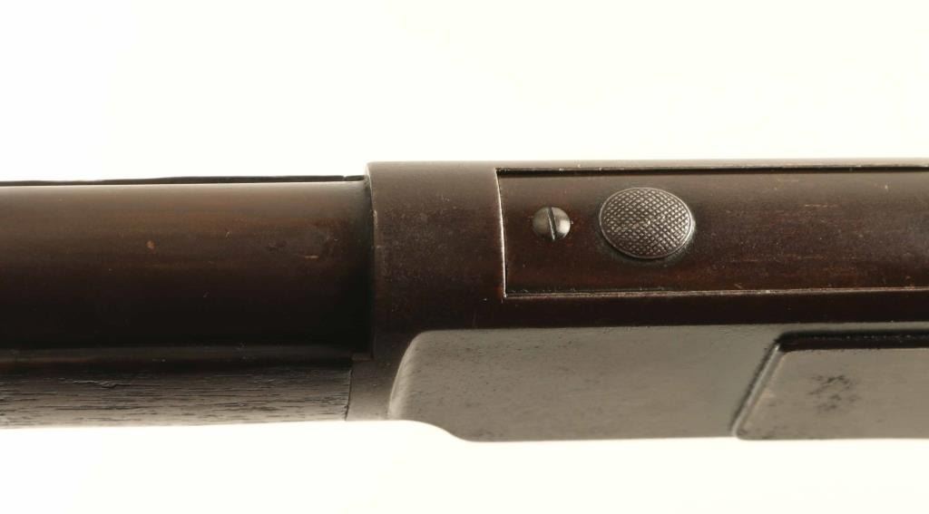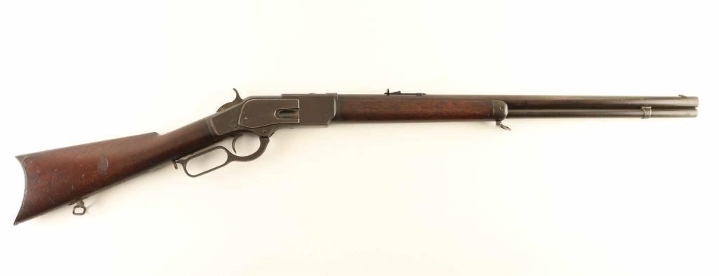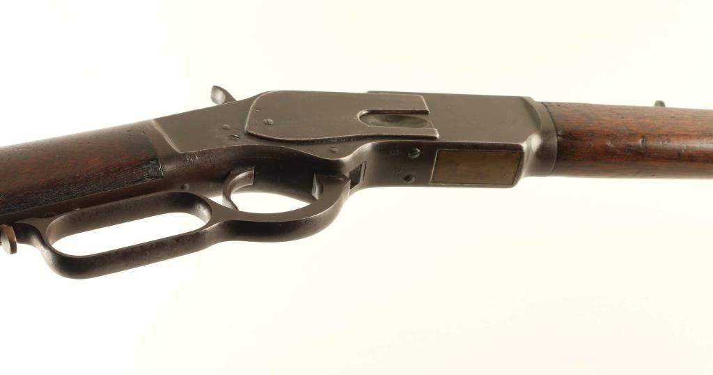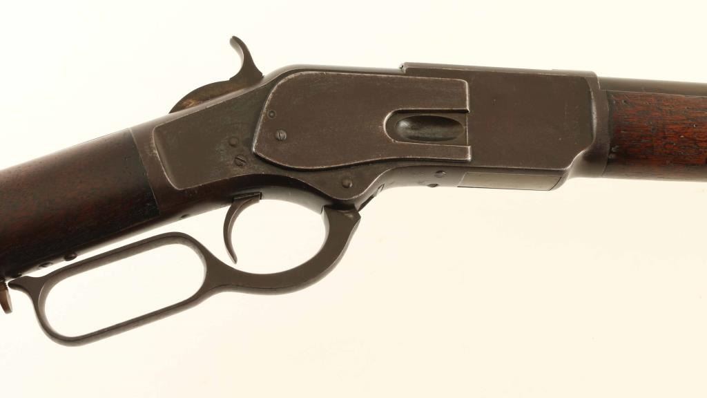 Extremely scarce and desirable first model 1873 rifle with raised thumb print dust cover, manufactured in 1874 (second year production). Features 24" round barrel, full length magazine tube, buckhorn sights (front blade is broken off the dovetail insert), straight wrist, finger lever latch, steel crescent buttplate with sliding cover for butt trap, sling swivels. Bore is good condition, bright with crisp rifling, scattered tiny pits throughout. Metal surfaces show majority coverage of dark grayish brown coloration, mostly smooth with some roughness from patina, especially on receiver sides and magazine tube. Moderate pitting and erosion visible on front of magazine cap. Lines of silver coloration from bare metal show on edges of receiver plate, corners & sharp edges, where action parts rub. Barrel and top of receiver and tang show mottled color with lighter coloration. Screw slots are generally good, with some light rust at buttplate screws. Wood is good condition, solid with visible grain and good fit to metal, many small dents and scratches throughout. Left side of wrist has been lightly carved with "SAM" in quarter inch high letters. Right side of butt has patch of deeper scratching and gouging. Small amount of wood missing from toe at buttplate, and from chips to handguard. Action is smooth. Markings on tang are shallow, even & readable. Two line barrel address is readable, bottom "patent" line is shallow, top line is visibly deeper. Condition is NRA Very Good *** Antique Firearm ***