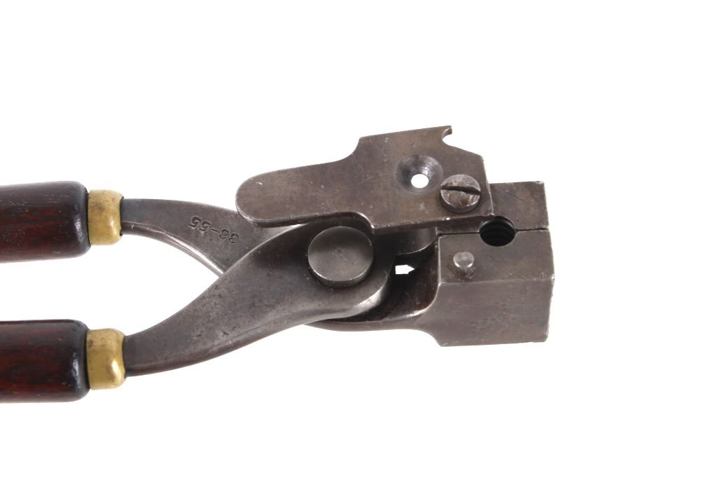 For your consideration, this lot includes an antique Winchester bullet mold 38-55 cal. The original wood handles are not cracked and are in good condition; the mold chamber shows wear expected from normal use. Additionally, the lot includes an Ideal Manufacturing 12 ga. shotgun shell crimper with wooden handles; the crimper does not have any visible damage, shows faded metal paint, and appears fully operational. The mold measures 9.5" H x 2.5" W; crimper measures 7.5" H x 5.5" W x 4.5" D.