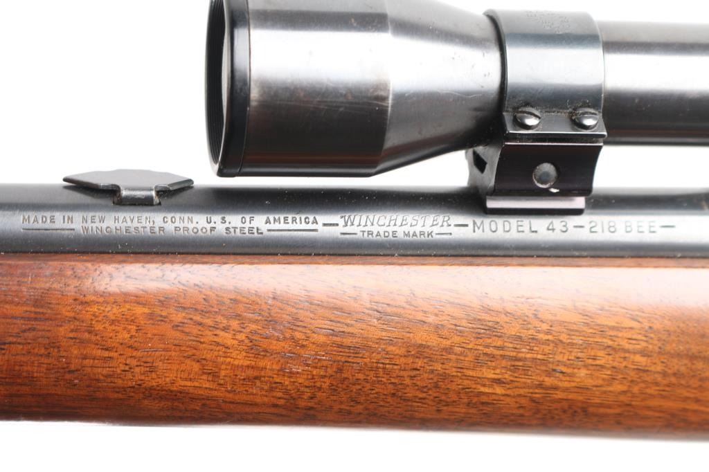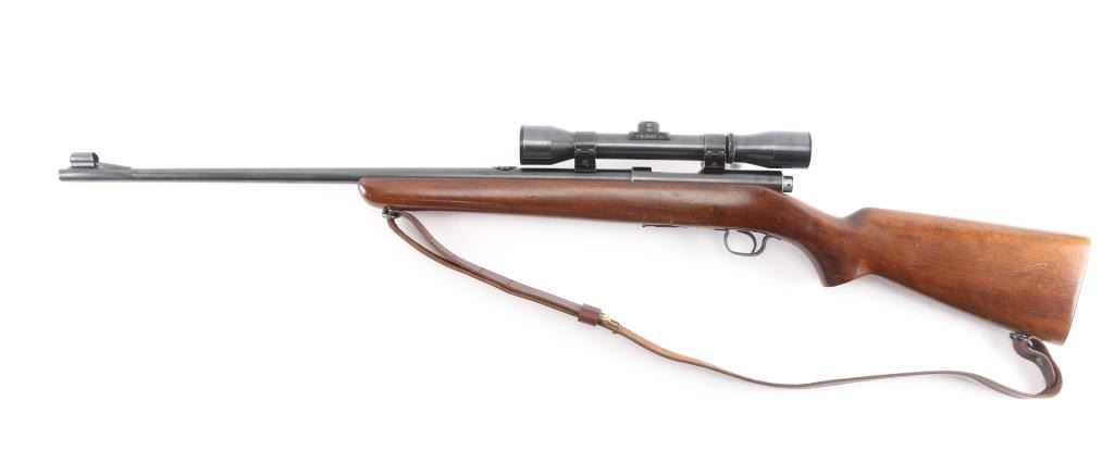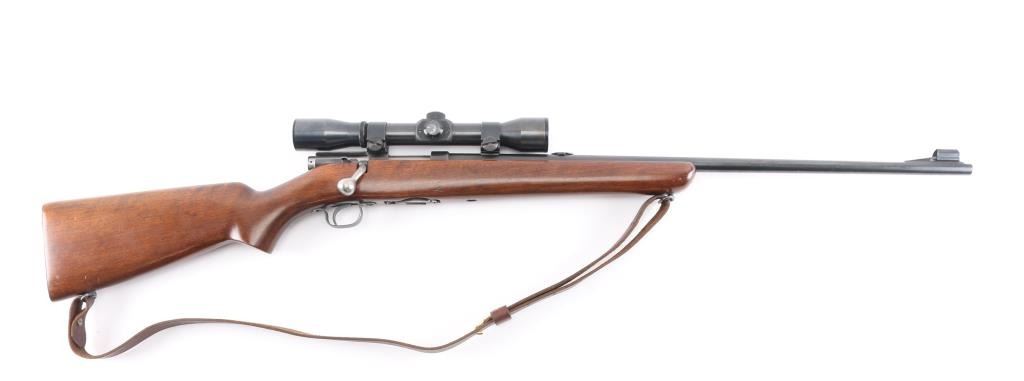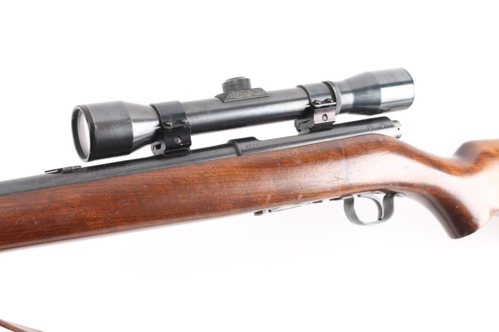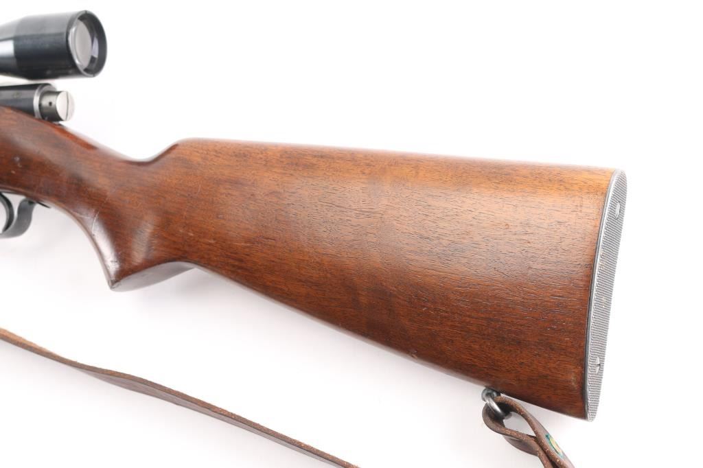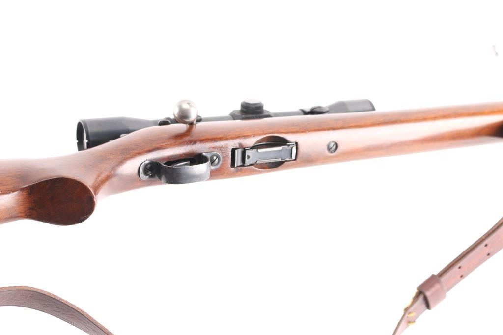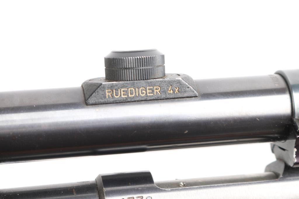 Increasingly scarce and collectible bolt action rifle, manufactured between 1949 and 1957. Features blued finish, smooth walnut stock, checkered milled steel buttplate, detachable magazine, sling swivels. ramped and hooded blade front sight, rear sight removed (dovetail filled with a blank), manual safety. Mounts a vintage Ruediger 4x scope with fine crosshair, using two piece Weaver bases on original factory tapped holes. Bright bore. Retains 80-90% original blue with normal toning and aging, overall very good. Stocks also very good with minor imperfections, slight scratches and handling marks. Good and tight mechanically. Includes one mag and good condition leather sling.