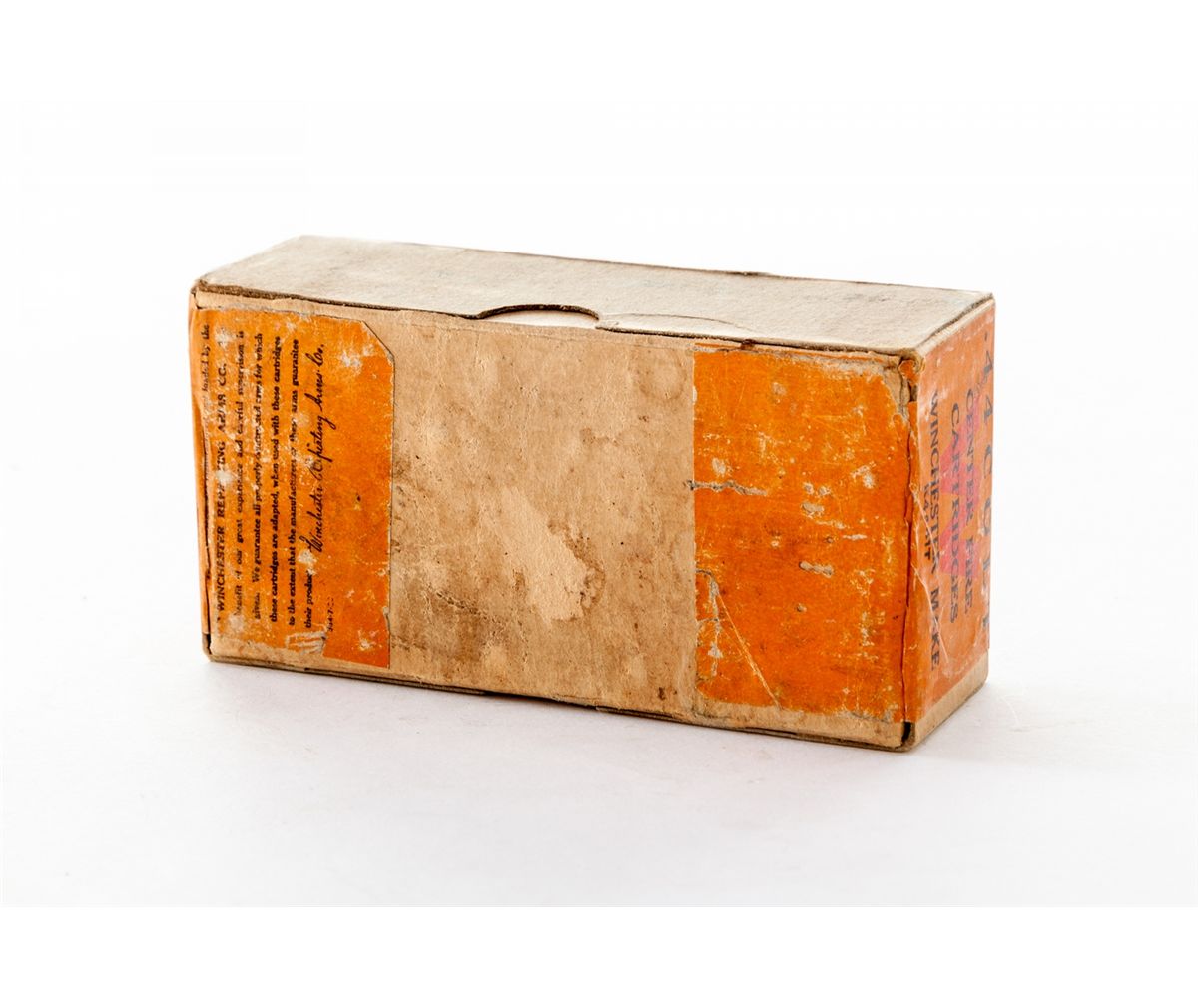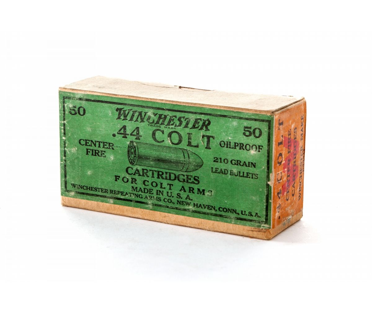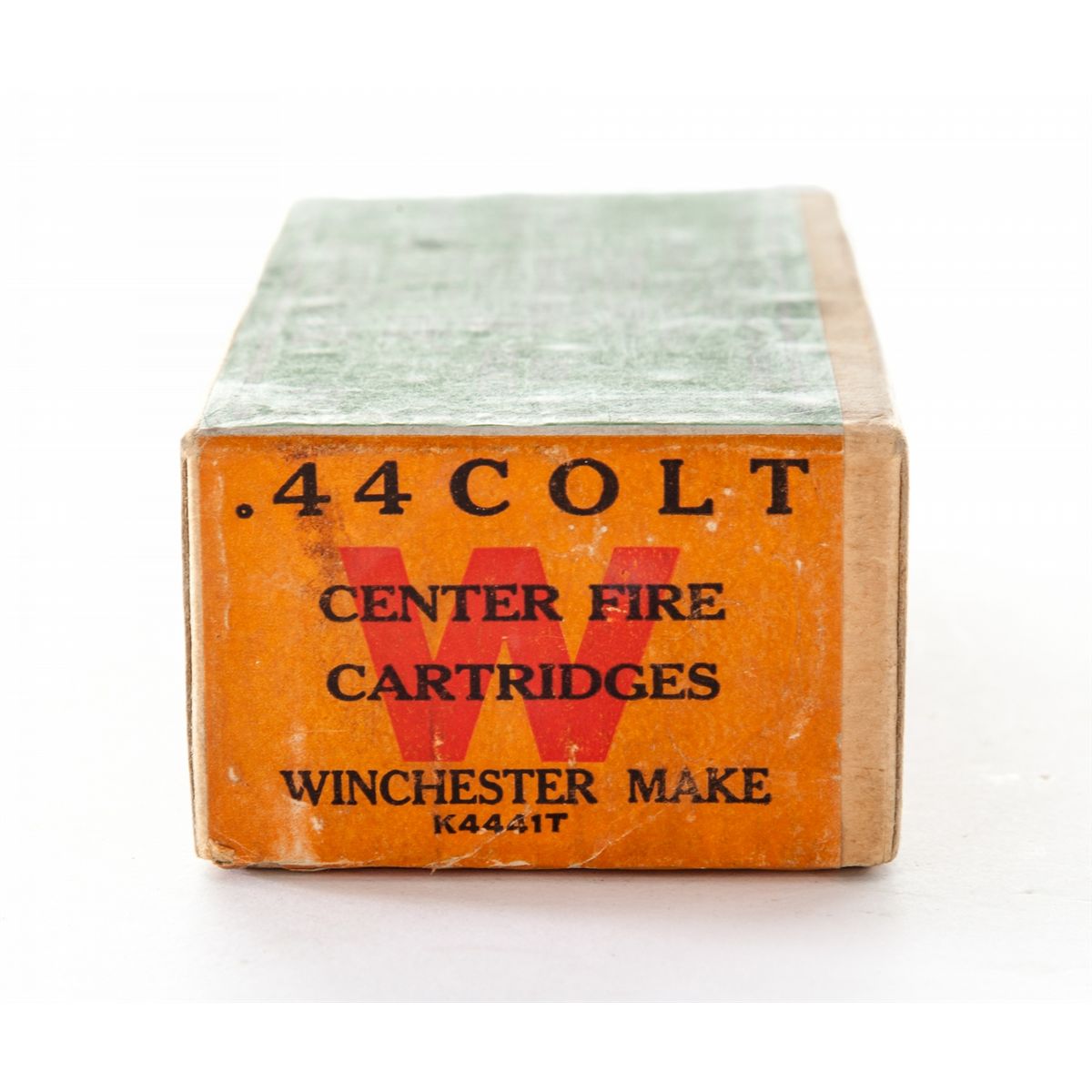 Sealed Two-Piece Winchester Box of .44 Colt Cartridges, green label with orange end labels, containing 50 oil-proofed 210-grain CF lead bullets. Orange end label marked with large red ''W'', and ''.44 Colt/Centerfire/Cartridges/Winchester Make/K4441T''. Also referred to as ''K-Coded Full Cover Two-Piece Box dating from the mid-1920''. Condition is excellent with some toning to orange portion at bottom, and very light thinning to top green portion. Est.: $500-$750.