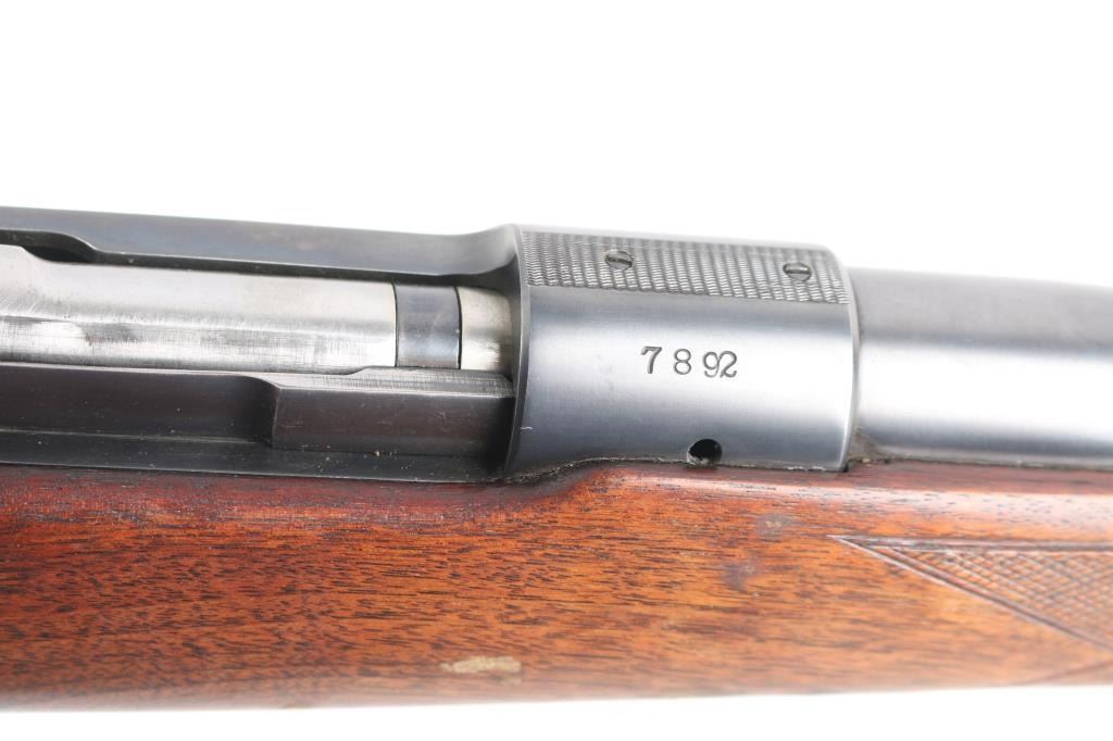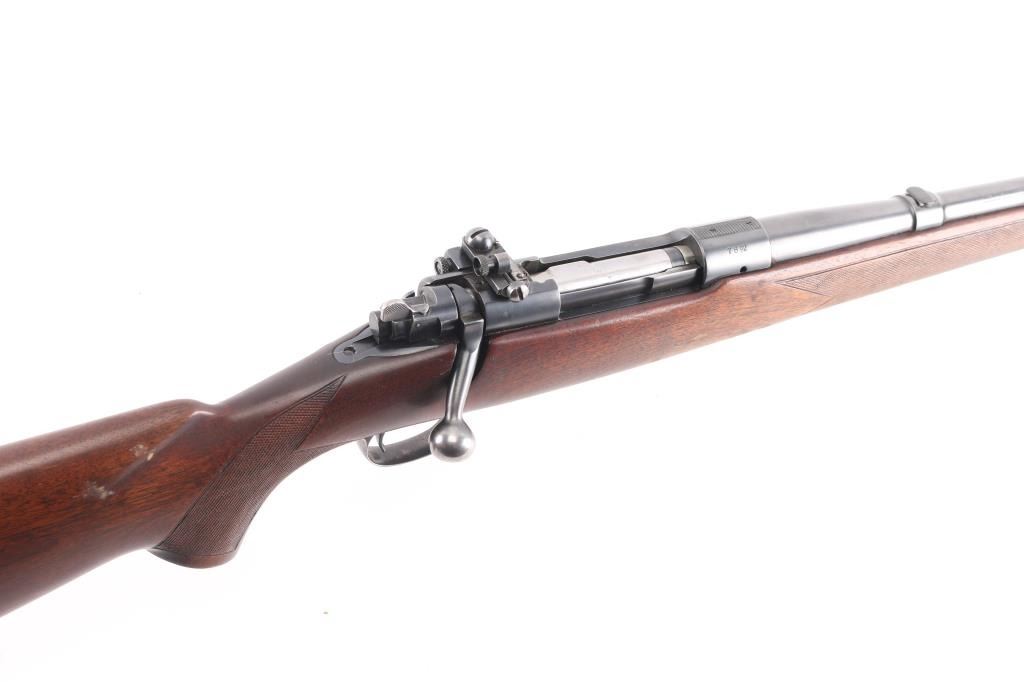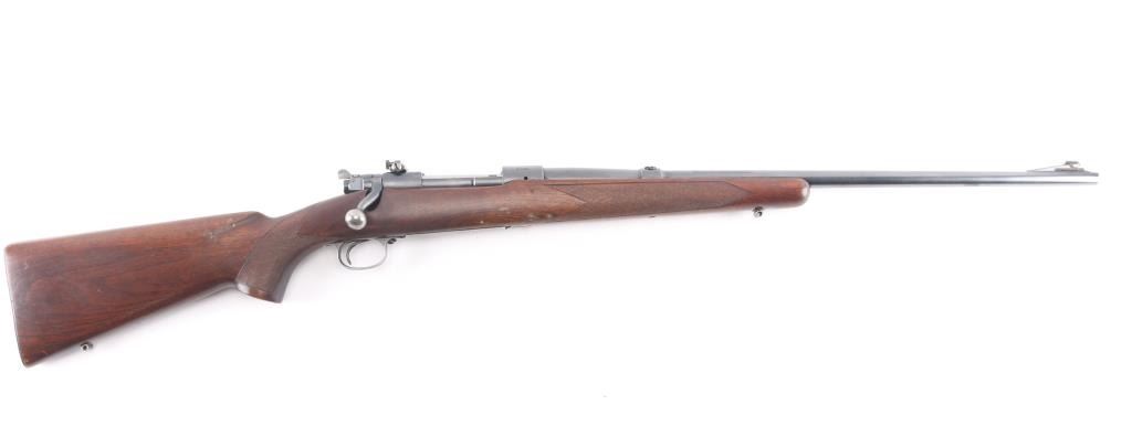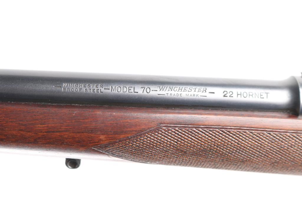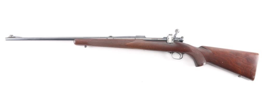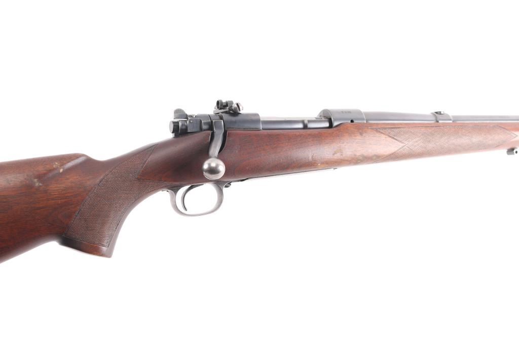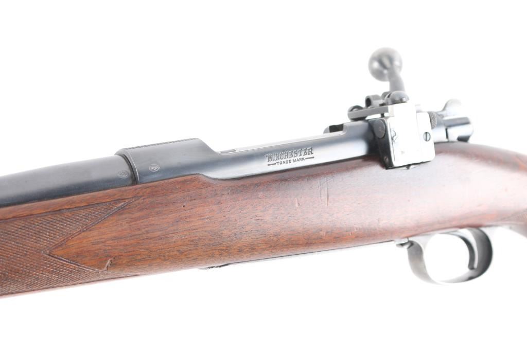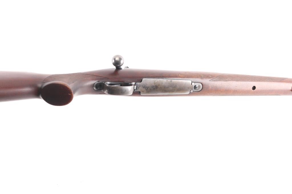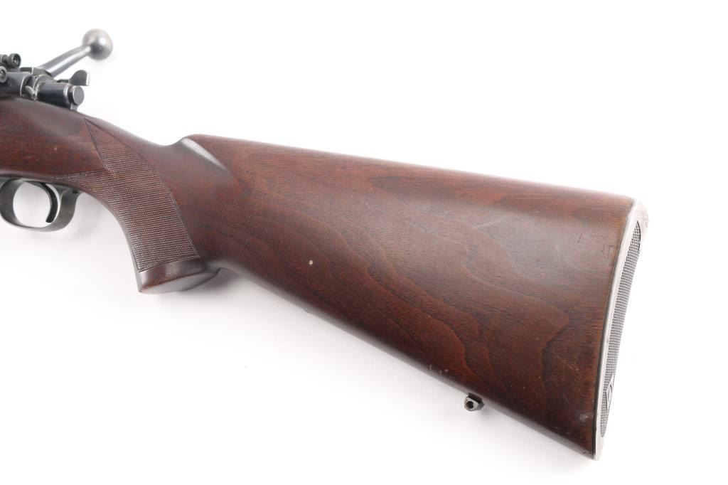 ‘Pre-64’ Scarce and desirable controlled round feed bolt action sporting rifle chambered in .22 Hornet. Manufactured in New Haven, CT circa 1937. Features a blued finish, 24” round tapered barrel, ramped blade front sight with brass bead, blank inserted into the rear sight dovetail, Lyman 66 receiver sight, serrated curved trigger, three-position type 1 safety on the rear on the bolt, swept-back bolt handle, five-round internal box magazine with hinged floorplate and hand checkered semi-pistol grip walnut stock with sling swivel studs, knurled steel buttplate & 13 9/16” LOP. The receiver bridge has been drilled & tapped in three places, all have filler screws. Matching serial numbers on the receiver and bolt (possibly forced matched). Rifle retains approximately 85% of its original blued finish showing scattered minor wear and heavy finish loss on the bottom metal. The action is mechanically sound, the bore is bright, the markings are sharp, and the walnut stock are good+ with minor imperfections & dings on the right side above the floorplate. Not high condition but an honest rifle with normal use and age.