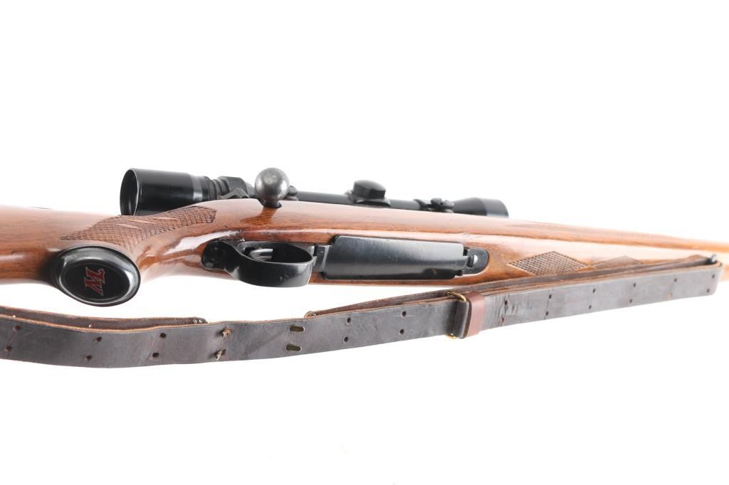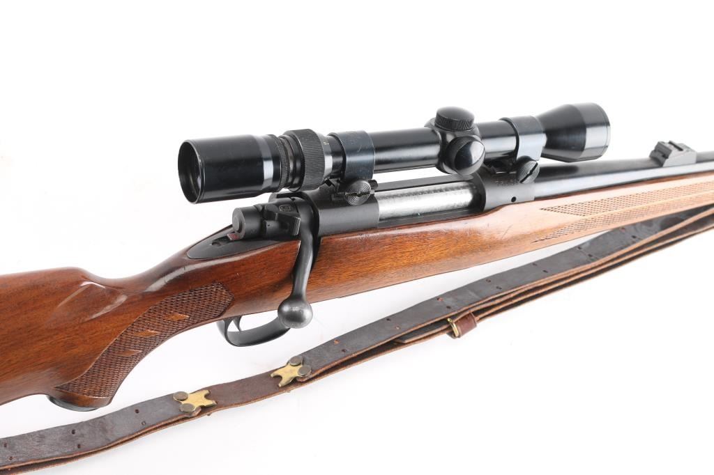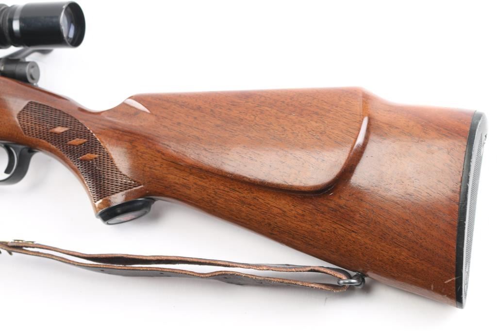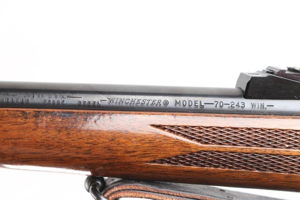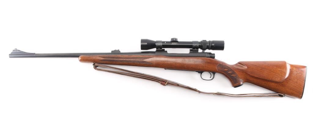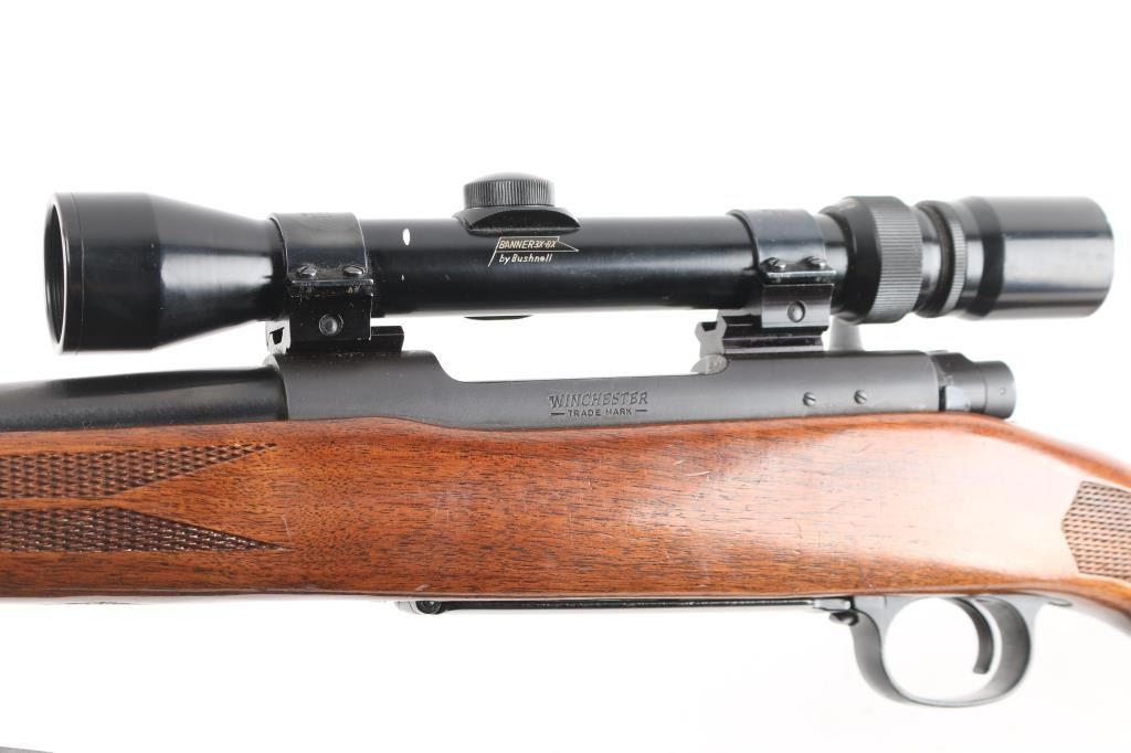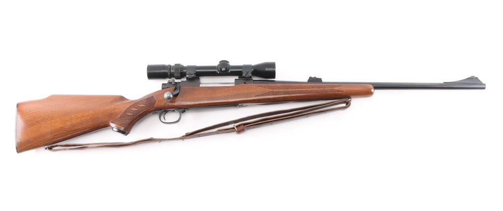 Push feed bolt action sporting rifle chambered in .243 Winchester, manufactured in New Haven, CT circa 1964, post 64, as serial numbers for post 64's started at 700,000. Features a blued finish, matte receiver, 22" tapered barrel, raised blade/bead front sight, adjustable rear sight base, empty dovetail. There is a three-position safety, jeweled bolt, serrated wide trigger, alloy trigger guard, internal box magazine with hinged floorplate and checkered walnut semi-pistol grip Monte Carlo stock with black grip cap, a right handed cheek piece and black plastic butt plate. The wood stock is checkered at the wrist and forearm. The blued finish is about 94%, with minor handling wear on the bolt knob, some scuffs on the triggerguard, stock is very good with minor scratches/dings, action is smooth/tight. the bore is excellent/bright. There is wear on the jeweled bolt. Mounted with a vintage Bushnell Banner 3x-8x scope, with Weaver rings. Clear Optics. M1907 style brown leather sling attached.