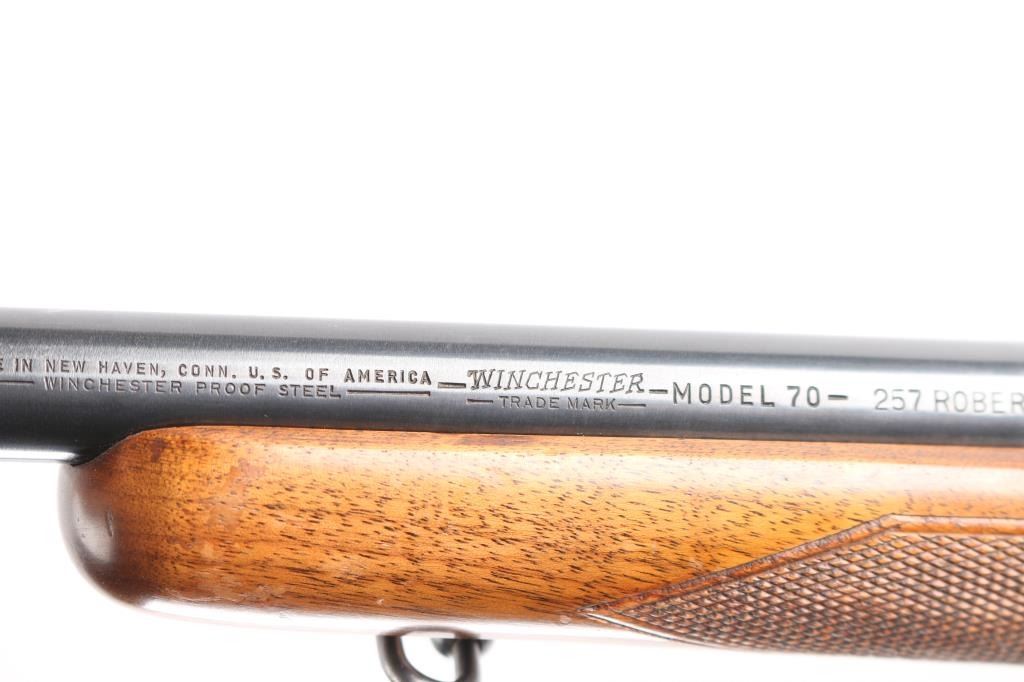 "Pre '64" Vintage bolt action rifle, factory chambered for 257 Roberts, circa 1951. Features blued finish, 24" barrel, ramped and hooded blade front sight, rear sight dovetail filled with blank, three position safety, hinged floorplate, two piece Weaver bases located on factory tapped holes. Mounts a Weaver KV 2-3/4-5x scope (third turret has magnification adjustment) with dot & superfine crosshair reticle. Checkered walnut stock without cheek piece, sling swivels, checkered steel buttplate. Bore is bright. Rifle shows very good plus used condition, minor wear. Wood is very good with minor marks and wear. Mechanically sound. Scope has clear view.