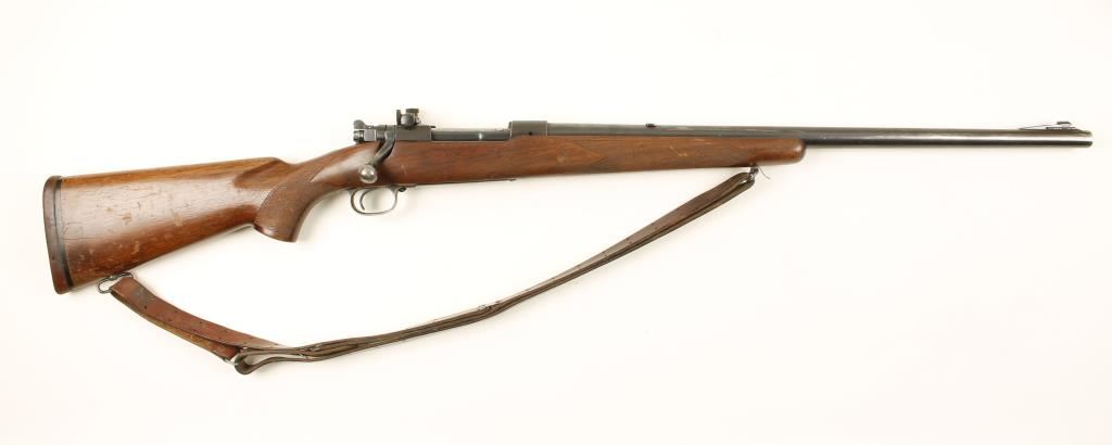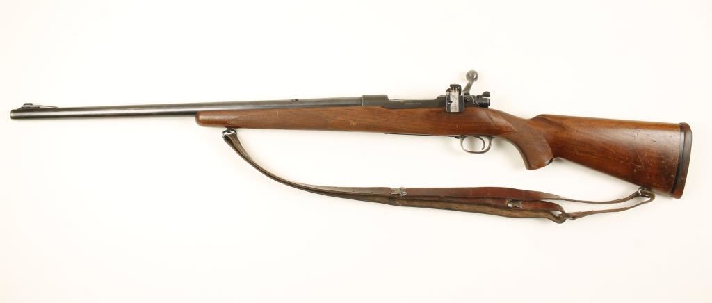 Winchester 375 hunting rifle for big game with heavy barrel which is 23". Wood stock which has some checkering. Winchester rubber butt pad and sling. Condition is overall Good. Some scratches and losses to stock due to use. High edge wear on barrel and action. Very desirable. *Modern Firearm*
