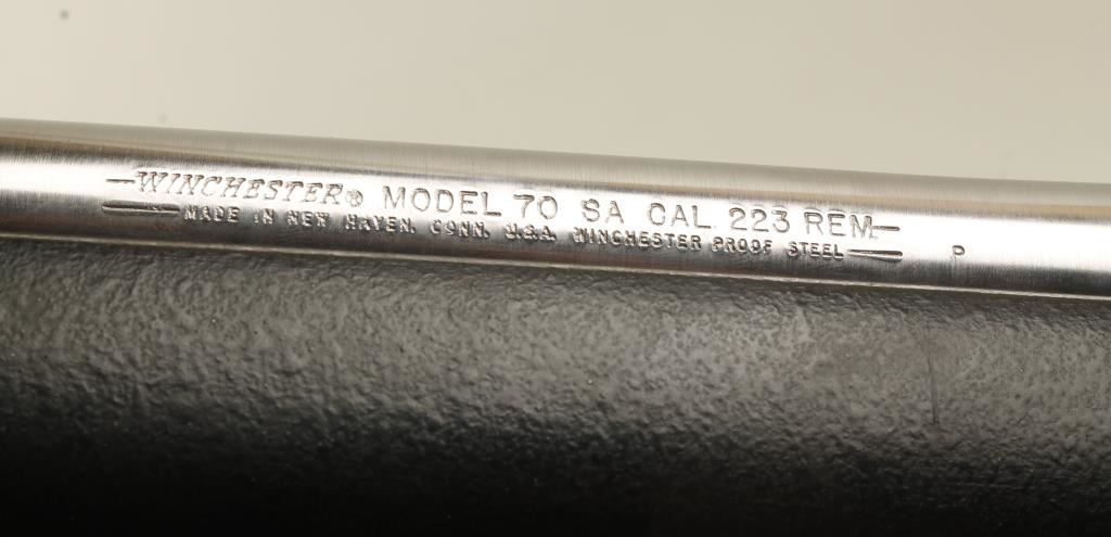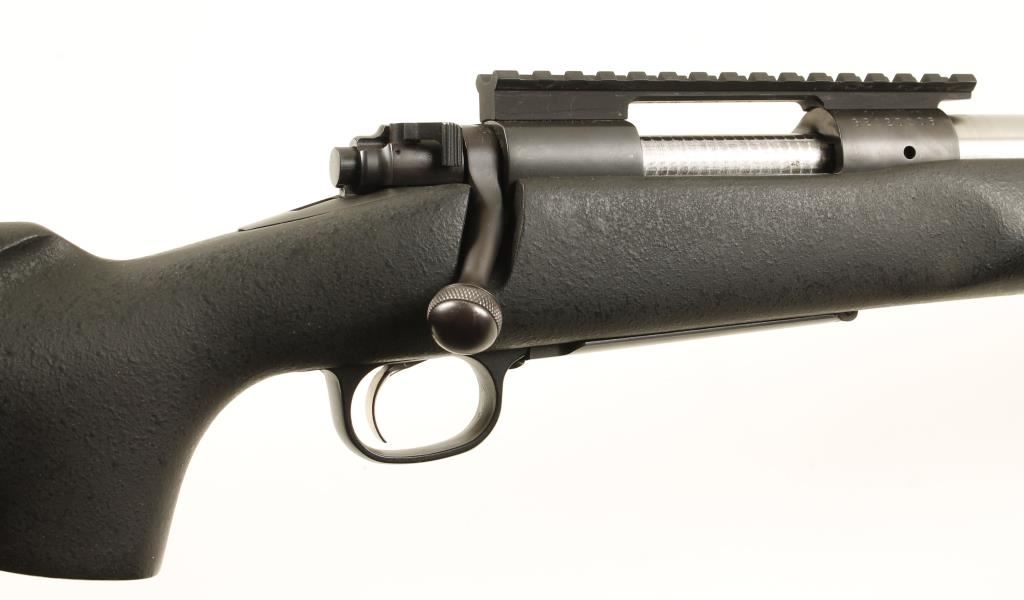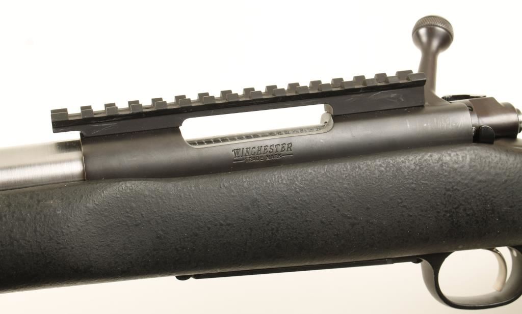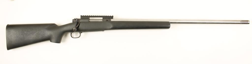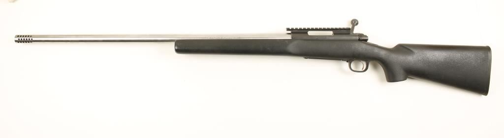 Blued and stainless bolt-action rifle with a 28" "Heavy Varmint" free-floated barrel and muzzle brake with 11 degree crown. Synthetic stock with beavertail forend. Finish is fine on all metal. Bore is mirror bright. Stock has a large rub on the forend bottom and a chip out of the edge of the pistol grip with numerous small scratches. Trigger guard has some scratches and edge wear on it. Recoil pad has collapsed some at the heel of the butt. There is a picatinney rail installed. Action works well with a light trigger pull. Condition is very good. *Modern Firearm*