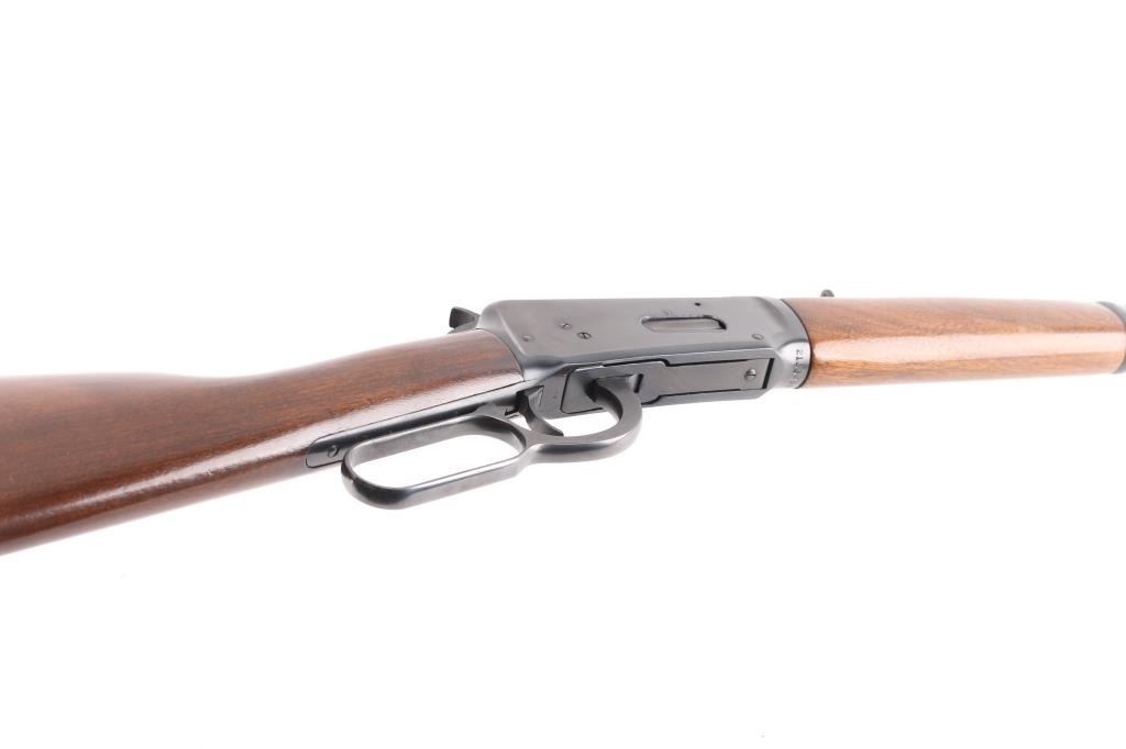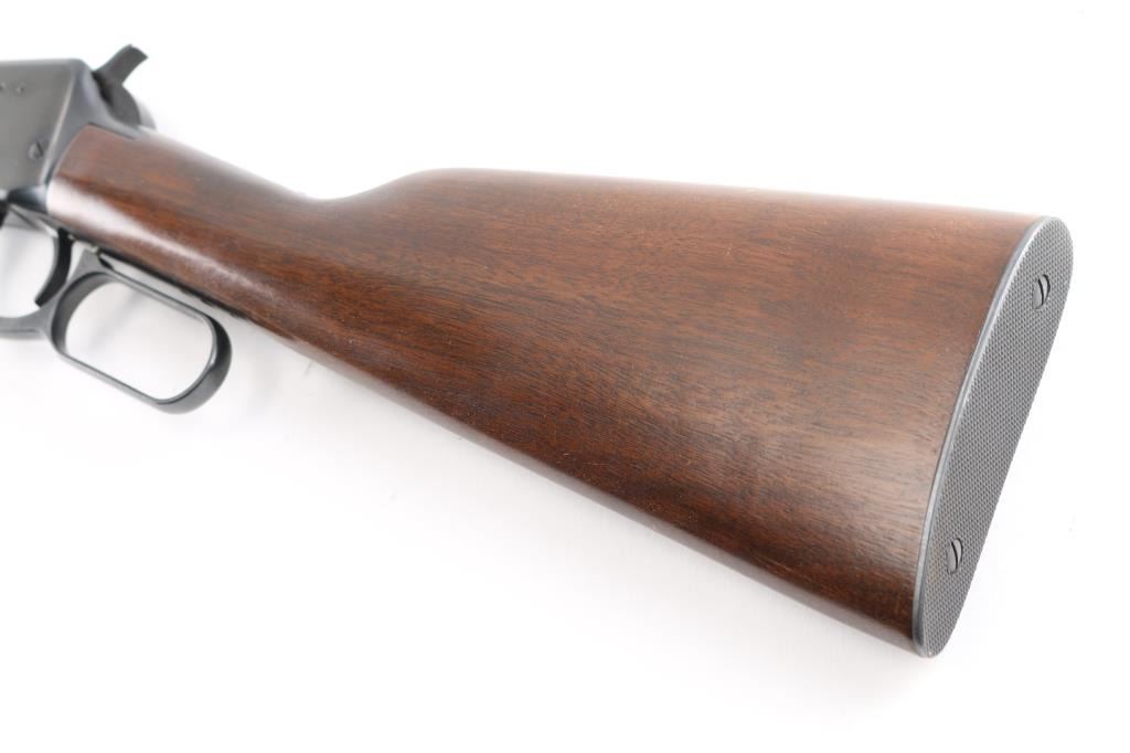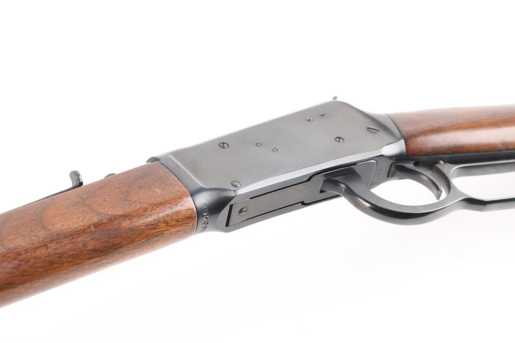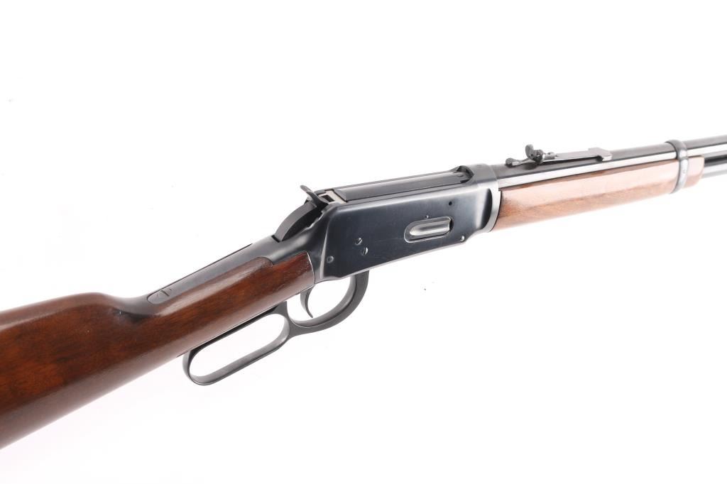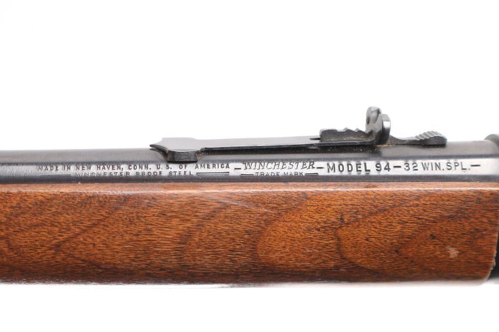 Pre-64 Eastern Carbine' Lever action repeating rifle manufactured in New Haven, CT circa 1954. Chambered for 32 Winchester Special. Features a blued finish, 20" tapered barrel, full-length tube magazine, hooded ramped blade/bead front sight, semi-buckhorn adjustable rear sight, smooth trigger, serrated hammer spur, two barrel bands, smooth walnut forend and straight grip shoulder stock with checkered steel buttplate. Bore is excellent/bright condition. Retains 96% original blue finish with very minor edge losses, scratches. Wood is excellent condition with a few very minor scratches/dings.