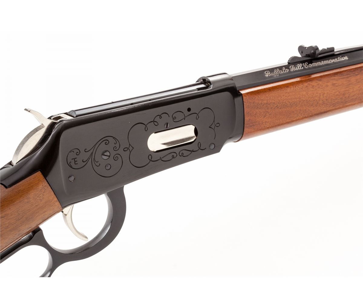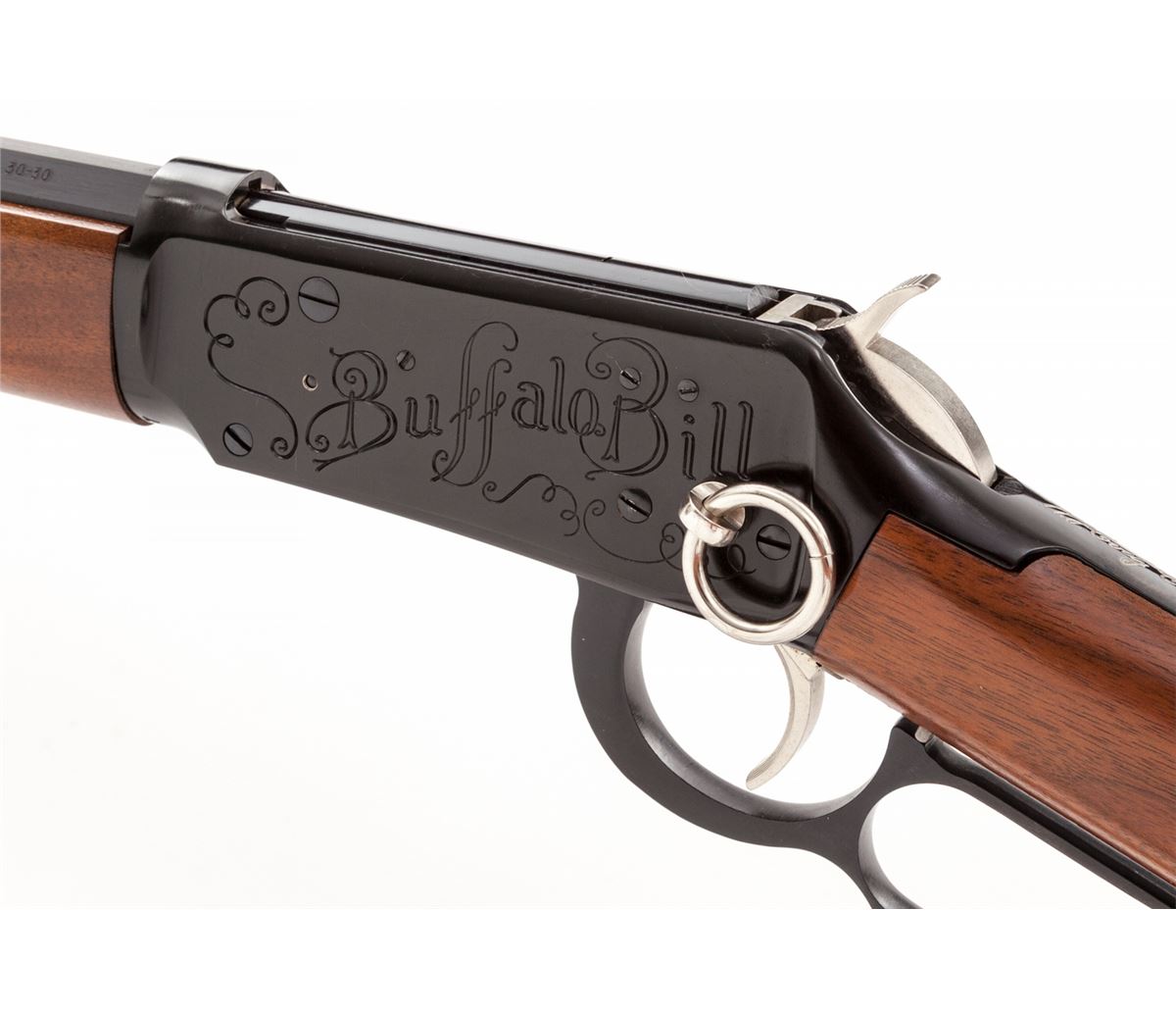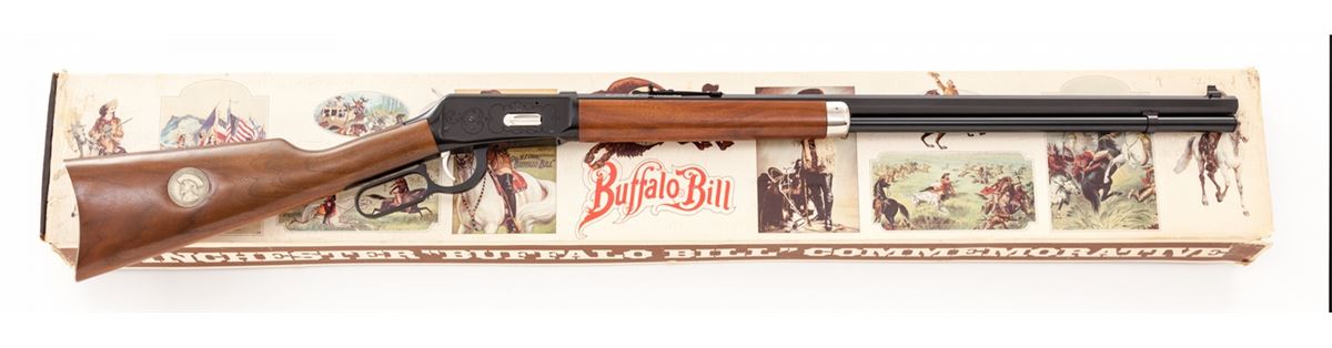 Winchester Model 94 Buffalo Bill Commemorative Lever Action Rifle, #WC3467, .30-30 cal., 26'' octagon barrel, walnut stock inlaid with Buffalo Bill commemorative medallion. Tang engraved ''W.F. Cody/Chief of Scouts'' in script. Condition is excellent, appearing as new and unfired, in original box with paperwork. Polychrome slipcover shows tatters and tears to edges. Est.: $750-$1,000. (Modern)
