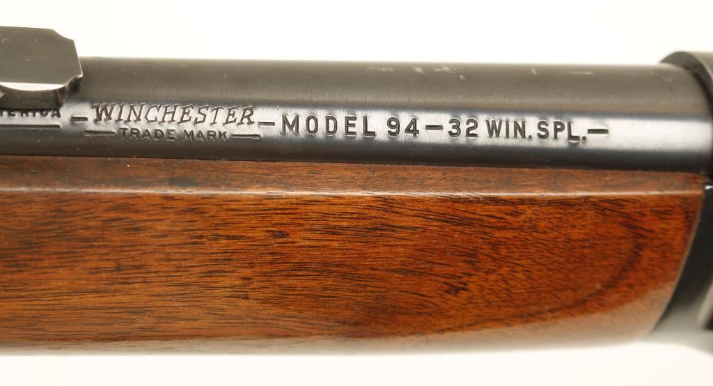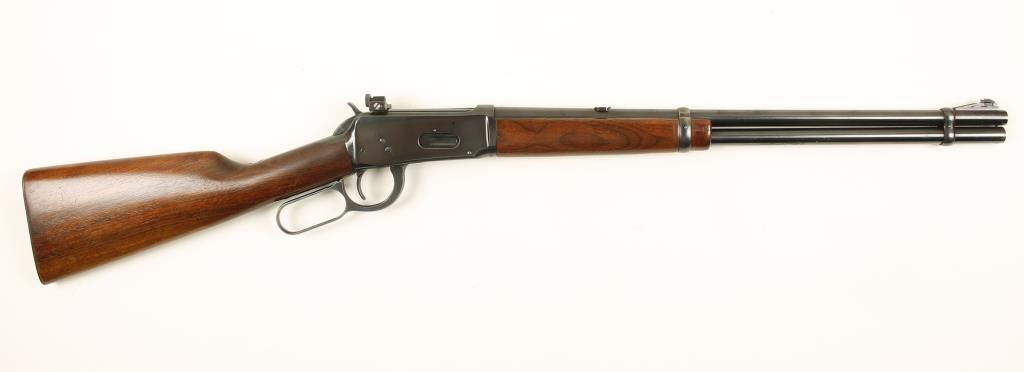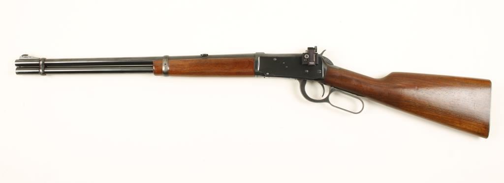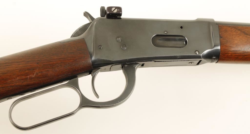 Blued lever-action rifle with a 20" barrel and a Williams receiver peep sight. Bluing has some edge wear and a few scratches. Barrel band has a lot of bluing loss. Wood has light scratches and rubs. Bore is bright and shiny with rifling. Action works well. Condition is very good. *Modern Firearm*