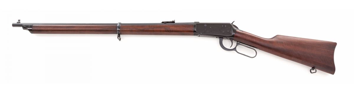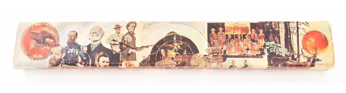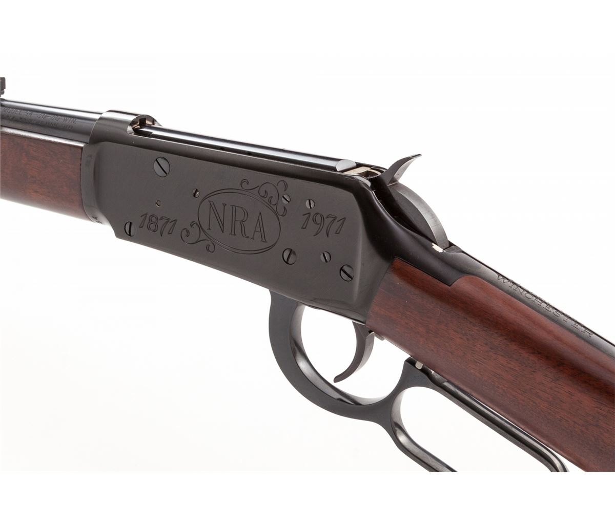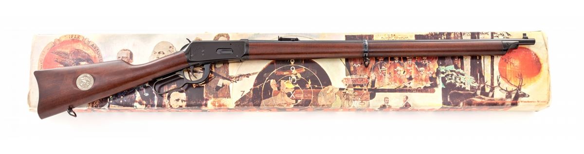 Winchester Model 94 NRA Centennial Lever Action Musket, #NRA1854, .30-30 cal., 26'' barrel, blue finish, full-length walnut stock inlaid with NRA commemorative medallion. Condition is excellent, appearing as new and unfired, in original box. Polychrome slipcover is very good showing minor wear. Est.: $750-$1,000. (Modern)
