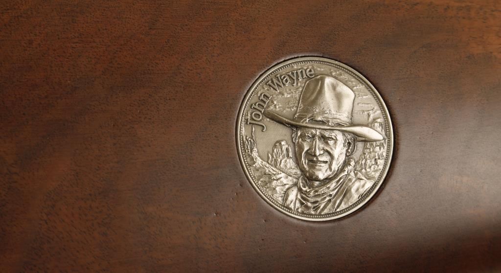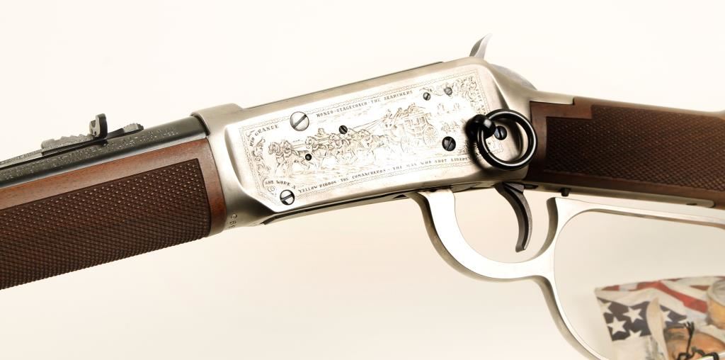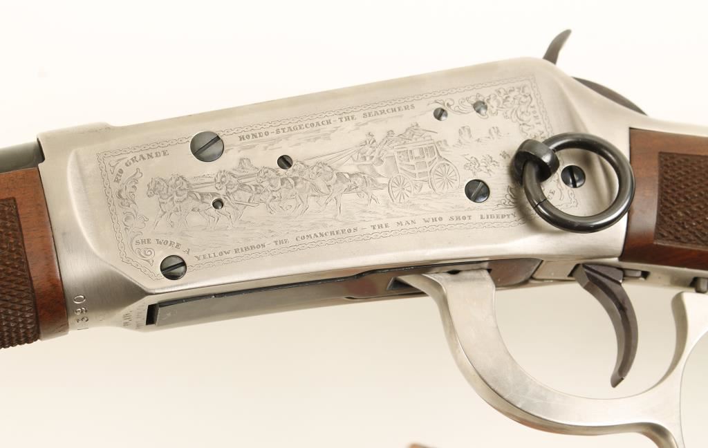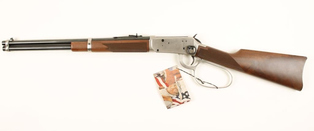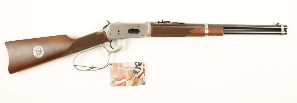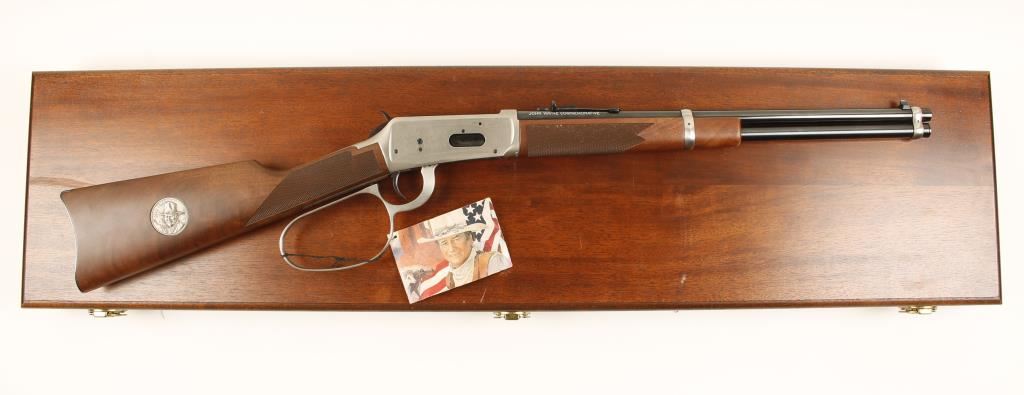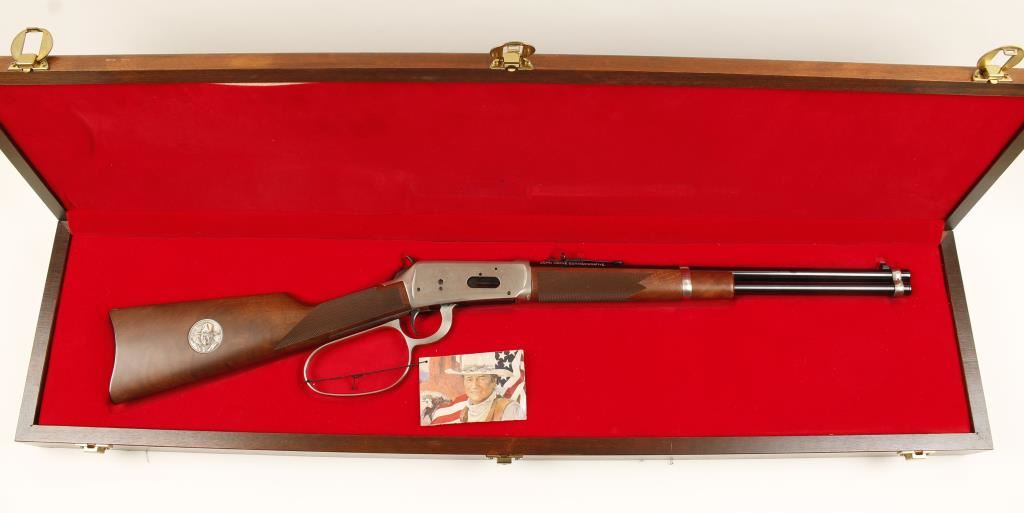 Lever action Commemorative Carbine celebrating the legendary John Wayne. Carbine has a brushed stainless receiver which is engraved with movies he did and oval oversize lever, nicely checkered wood stock and fore arm with John Wayne medallion inlet into the right side of the stock. In deluxe wood presentation case. Condition: Excellent *Modern Firearm*