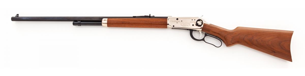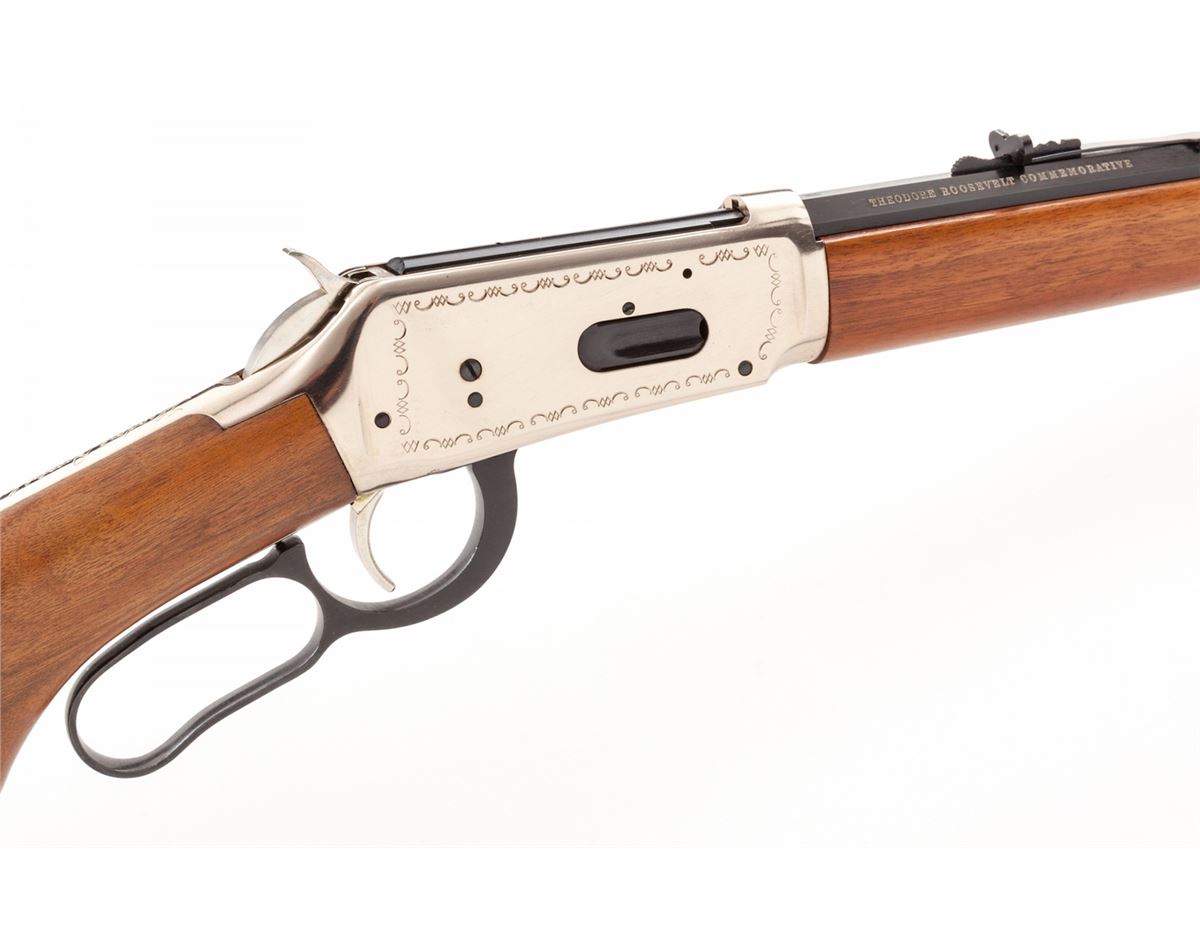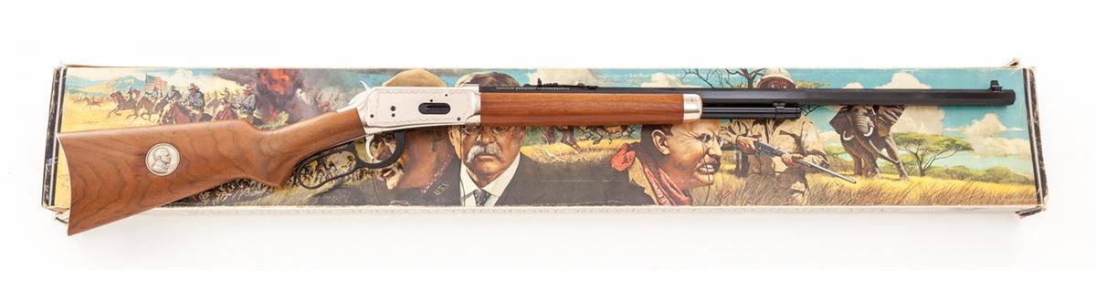 Winchester Model 94 Theodore Roosevelt Commemorative Lever Action Rifle, #TR28741, .30-30 cal., 26'' octagon barrel, lightly engraved frame, smooth walnut stock inlaid with Theodore Roosevelt commemorative medallion. Tang marked ''Theodore Roosevelt'' in script. Condition is excellent, appearing as new and unfired, in original box. Polychrome slipcover shows slight tears and wear to edges. Est.: $600-$800. (Modern)