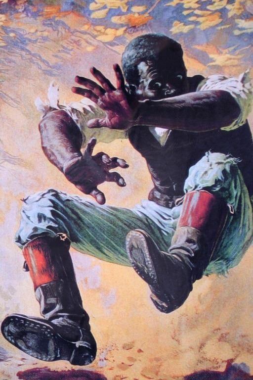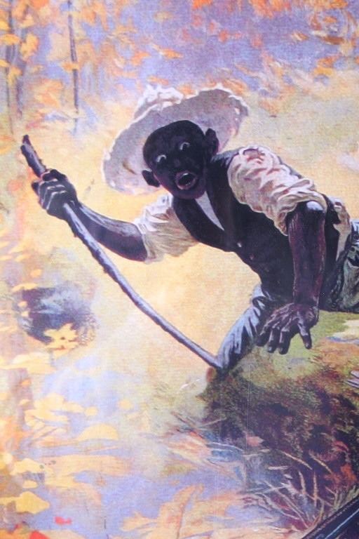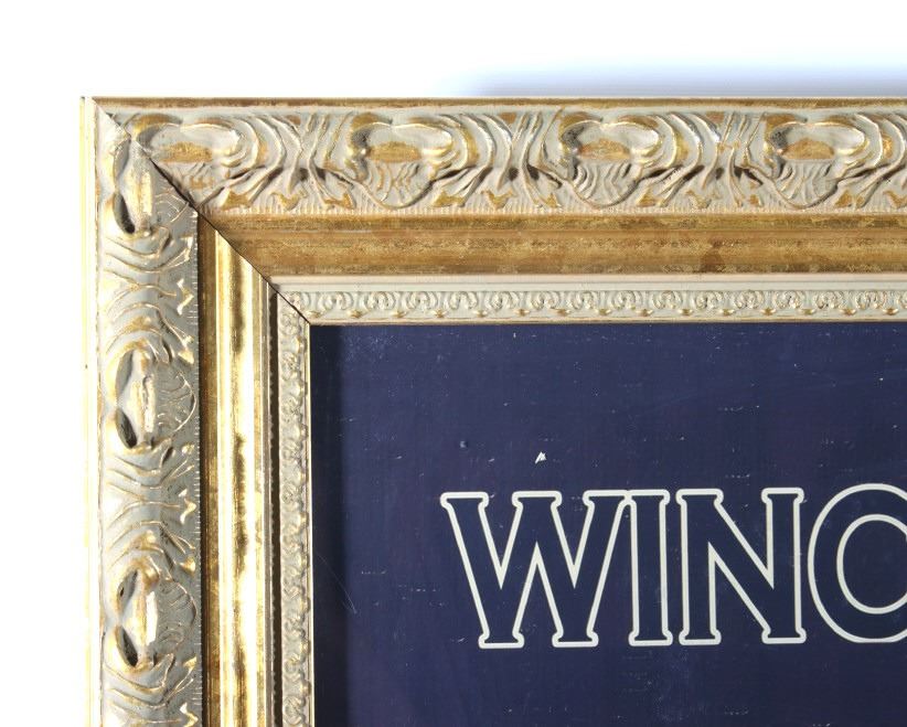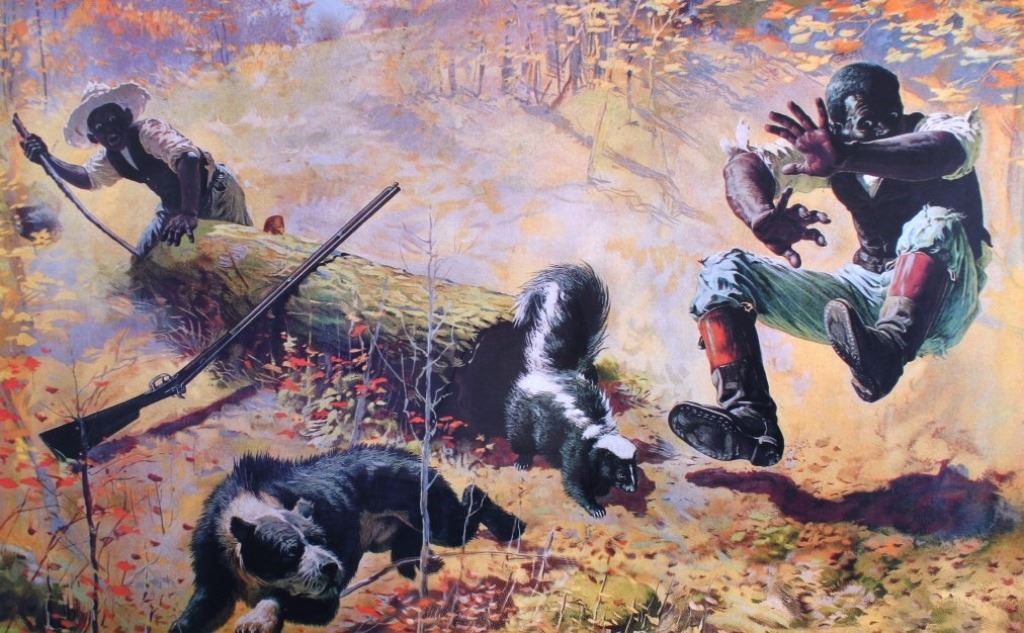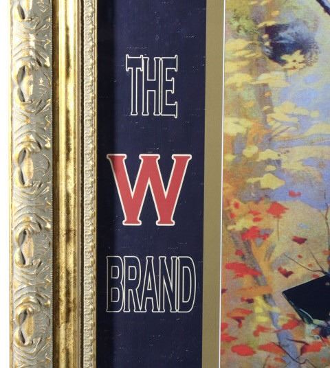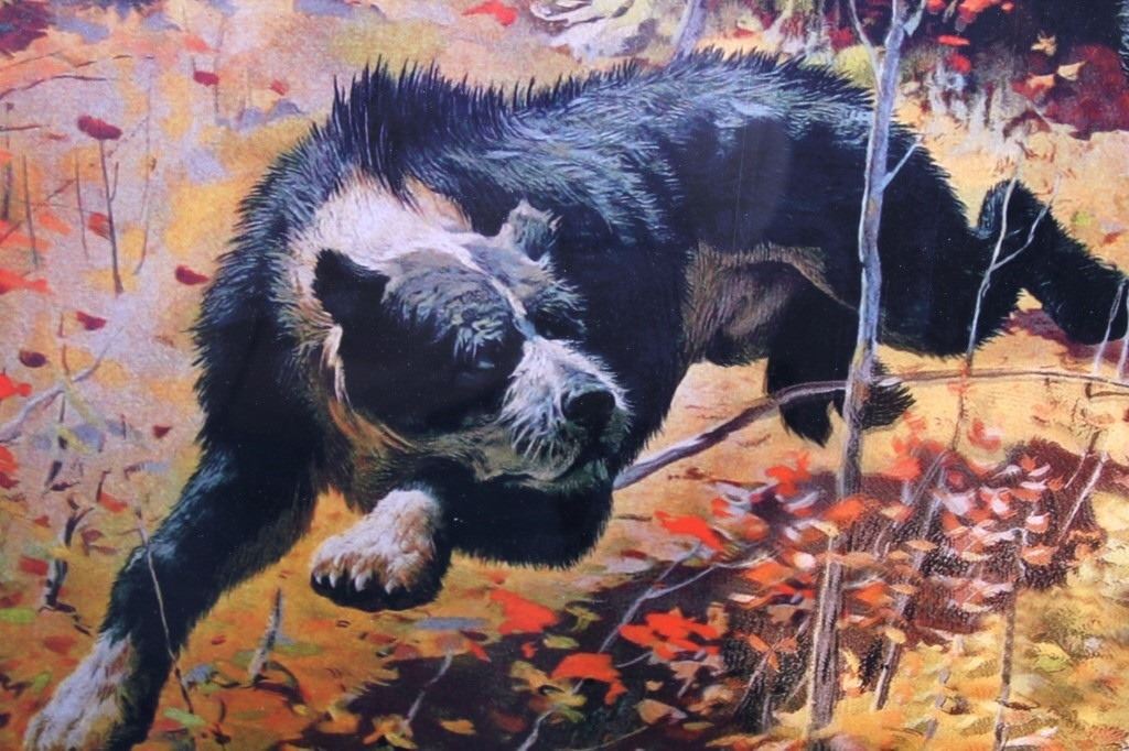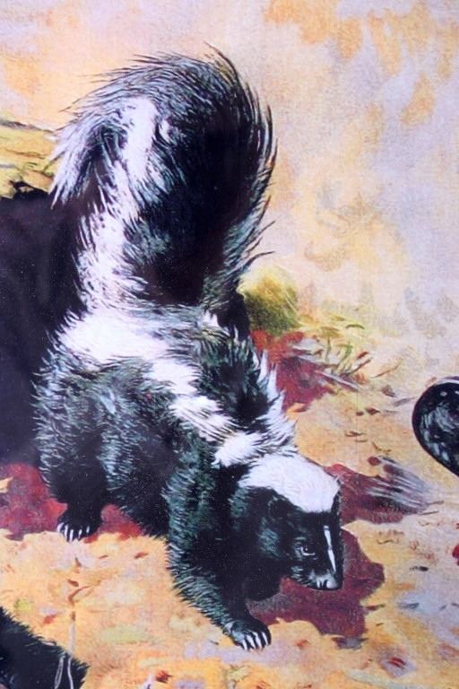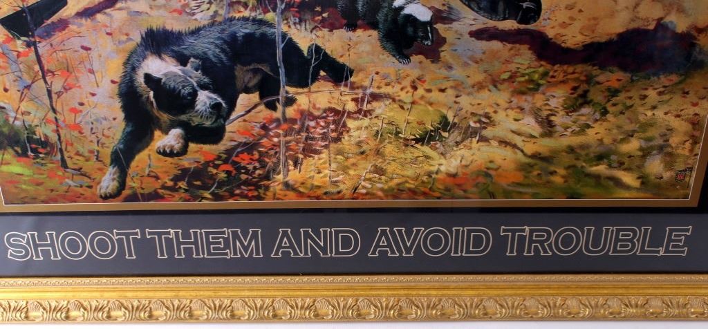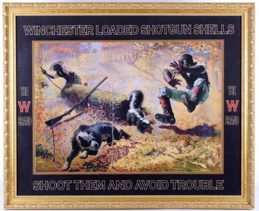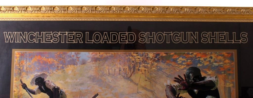Featured in this lot we have a print of a 1908 Winchester shells advertisement. The print was supposed to be a humorous portrayal of a skunk being prodded out of a hollow log. An African-American father and his son, along with their dog, are reacting to the skunk as it emerges from the log and raises its tail; ironically their shotgun is propped against the log, just out of reach. At the top of the print in skeleton lettering is "Winchester Loaded Shotgun Shells". At the bottom of the print in skeleton lettering is "Shoot Them and Avoid Trouble". The picture is flanked by "The W Brand" logo. When the advertisement was originally released in 1908 it proved to be too controversial because of the misinterpreted tag line. Winchester recalled them to trim off the wording. Later in 1936 they were re-released with just the image. This is a reproduction of the original. It is in an attractive gilded wood frame and shows good condition. The frame measures 44" wide by 36" tall.