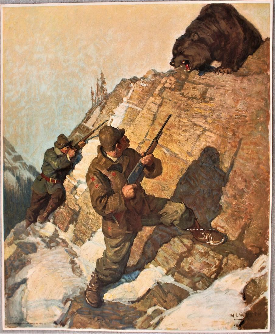 Interesting vintage Winchester advertising poster depicting hunting scene, originally done by NC Wyeth. Marked in lower left, and measuring 14"x 17".
