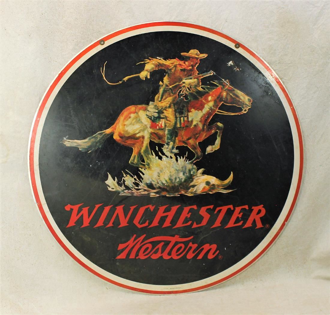 Fantastic round double sided sign with the image of the Winchester Express rider. Very desirable sign with great graphics, in very good condition with less than typical dings. Measuring 36" in diameter.