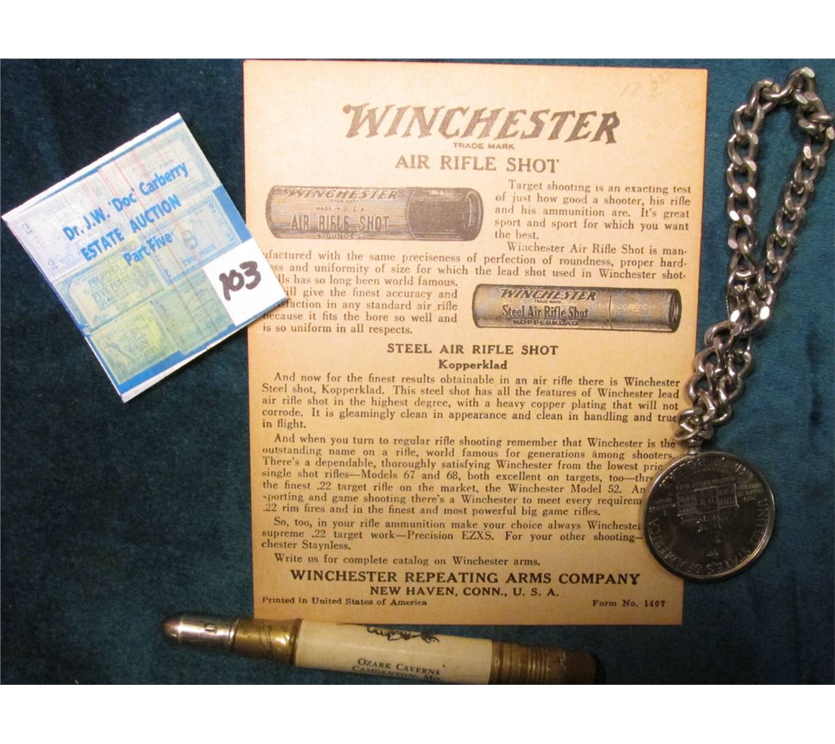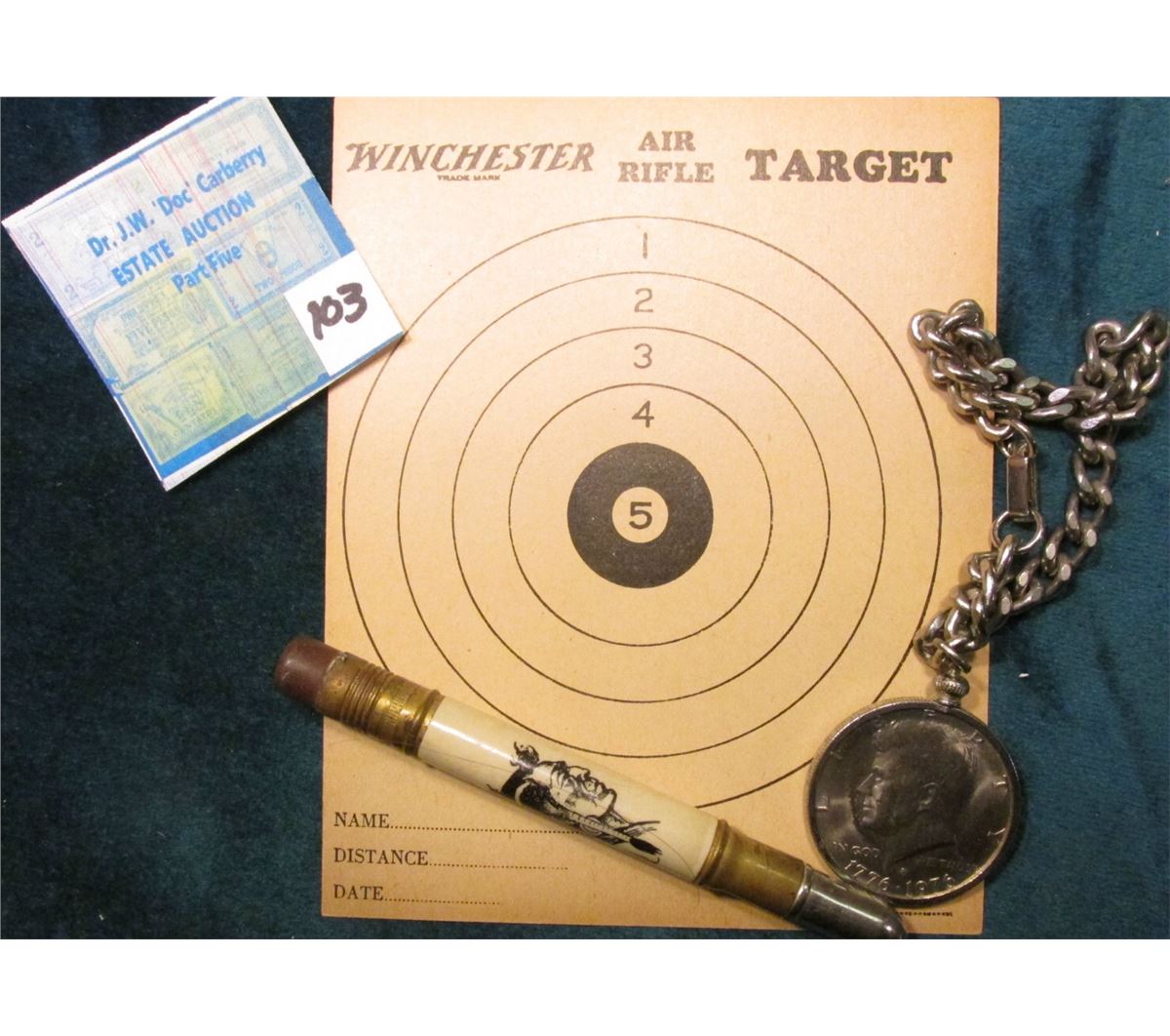 "Winchester Air Rifle Target" advertising "Air Rifle Shot" on the Reverse; Advertising Pull-out Pencil with Indian design "Ozark Caverns Camdenton, Mo."; & 1776-1976 D Bicentennial Half Dollar Key Chain.