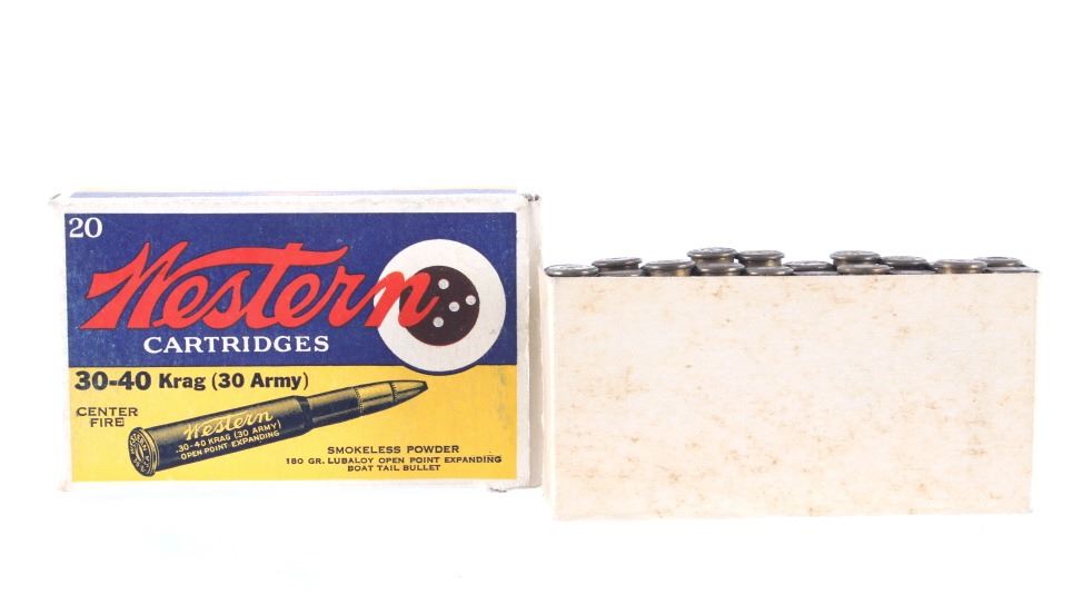 Lot consisting of one full box containing 20 factory Winchester/Western Super X .30-40 Krag cartridges, 180 grain Silvertip, box is excellent; three Western cartridge boxes of 20 each containing fired .30-40 Krag brass; one Sportload box containing ten loaded .30-40 Krag rounds and four fired cases. Fired brass is a mixture of Remington-UMC, Western and Peters headstamps.